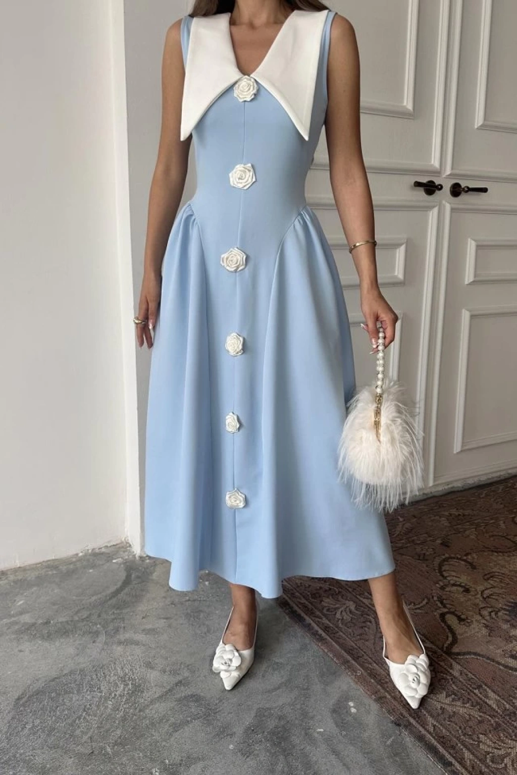 Mavi Gül Detaylı Atlas Elbise