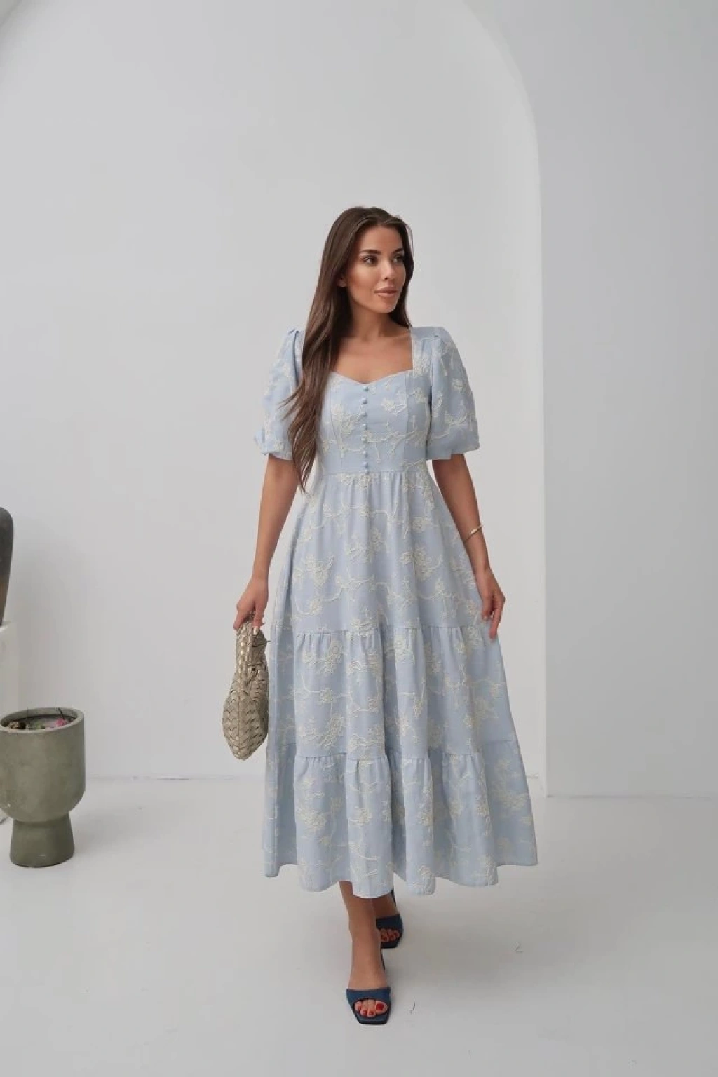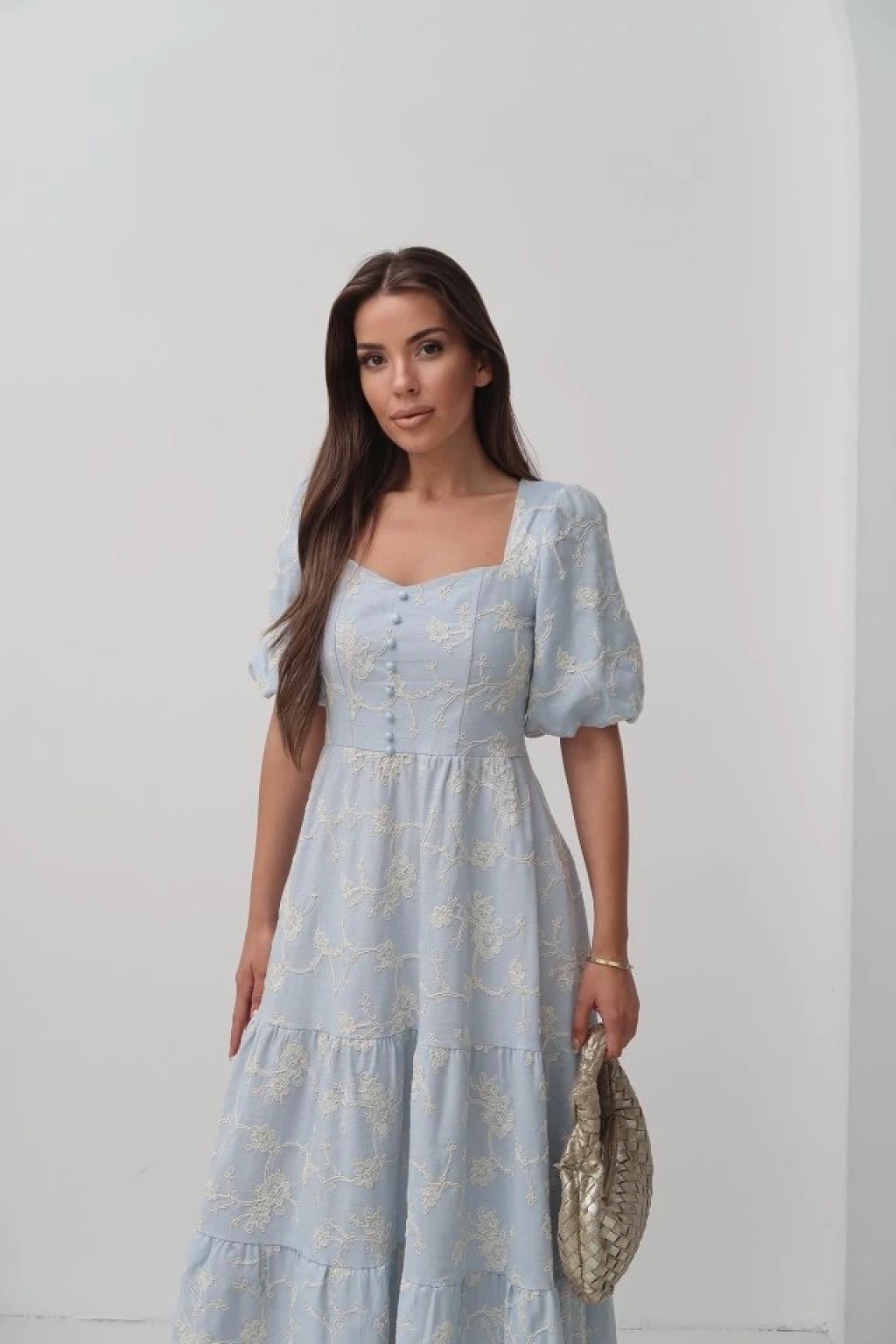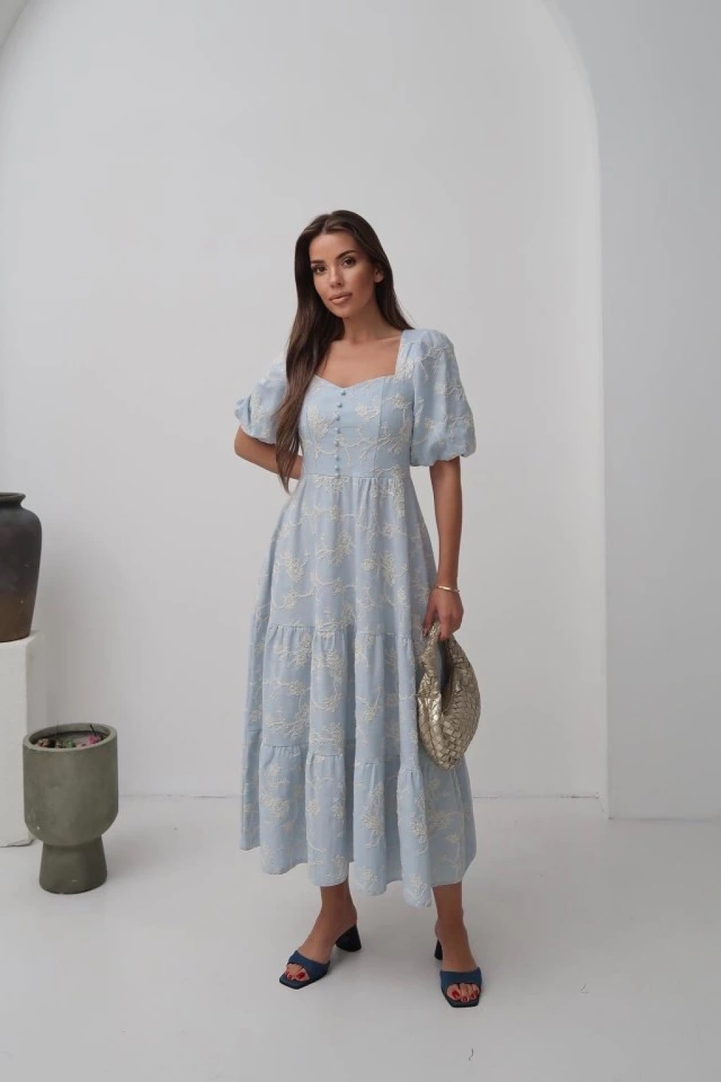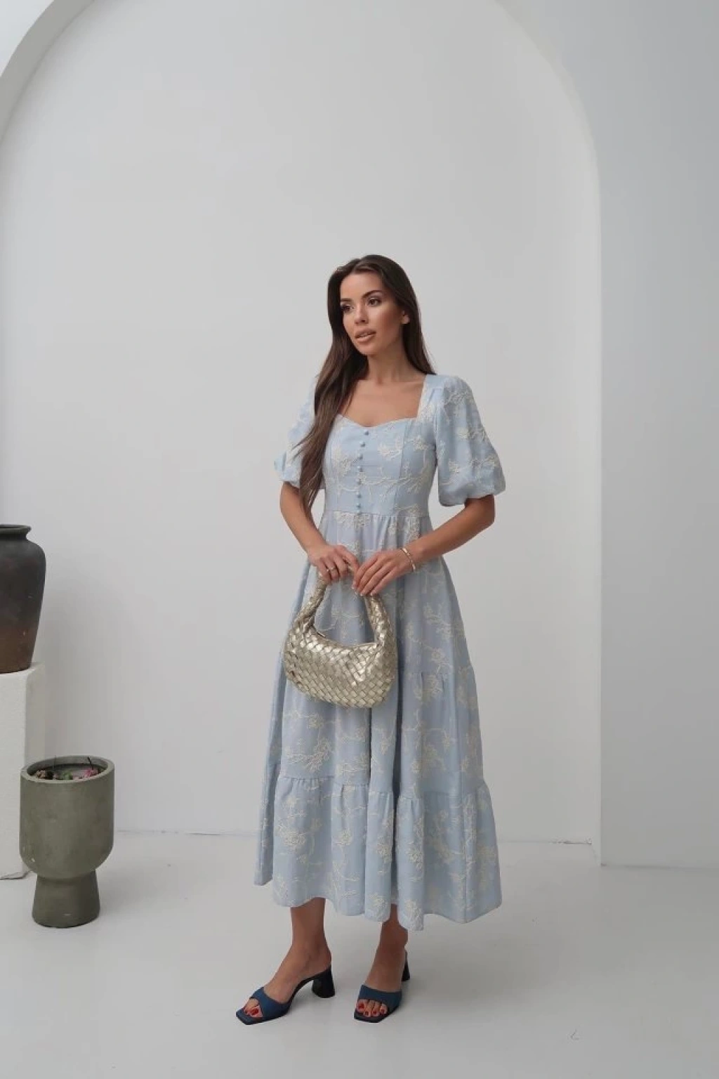 Bebe Mavi Süs Düğmeli Balon Kollu Elbise