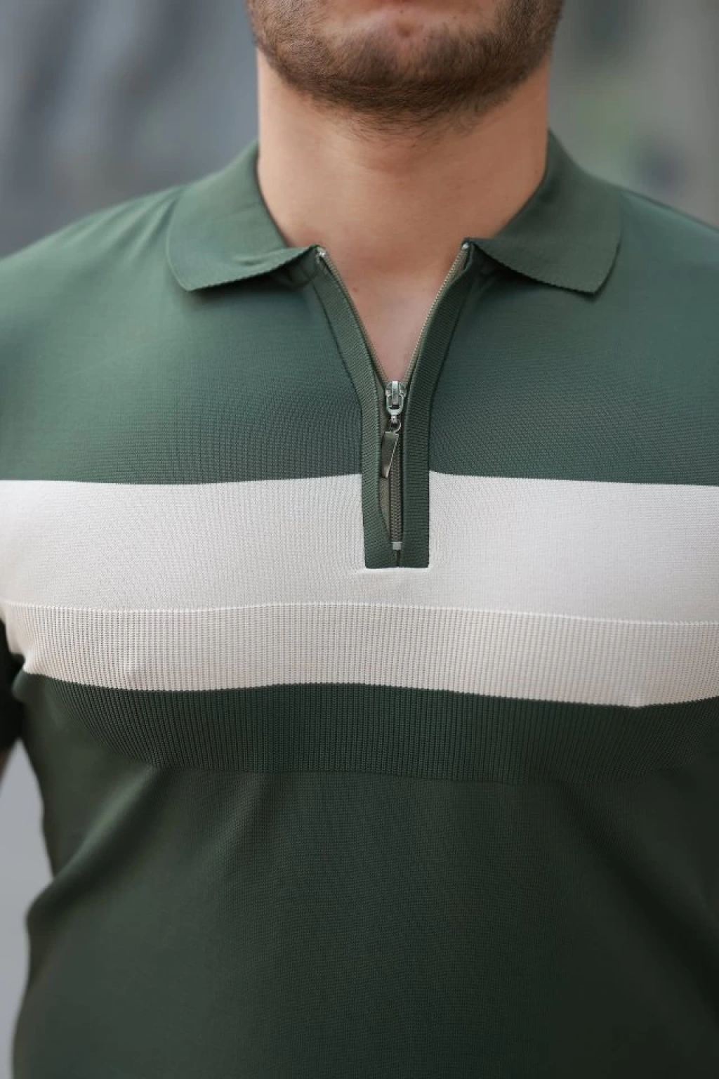 Erkek Fermuar Yakalı şerit Renk Desenli Kısa Kollu Tişört