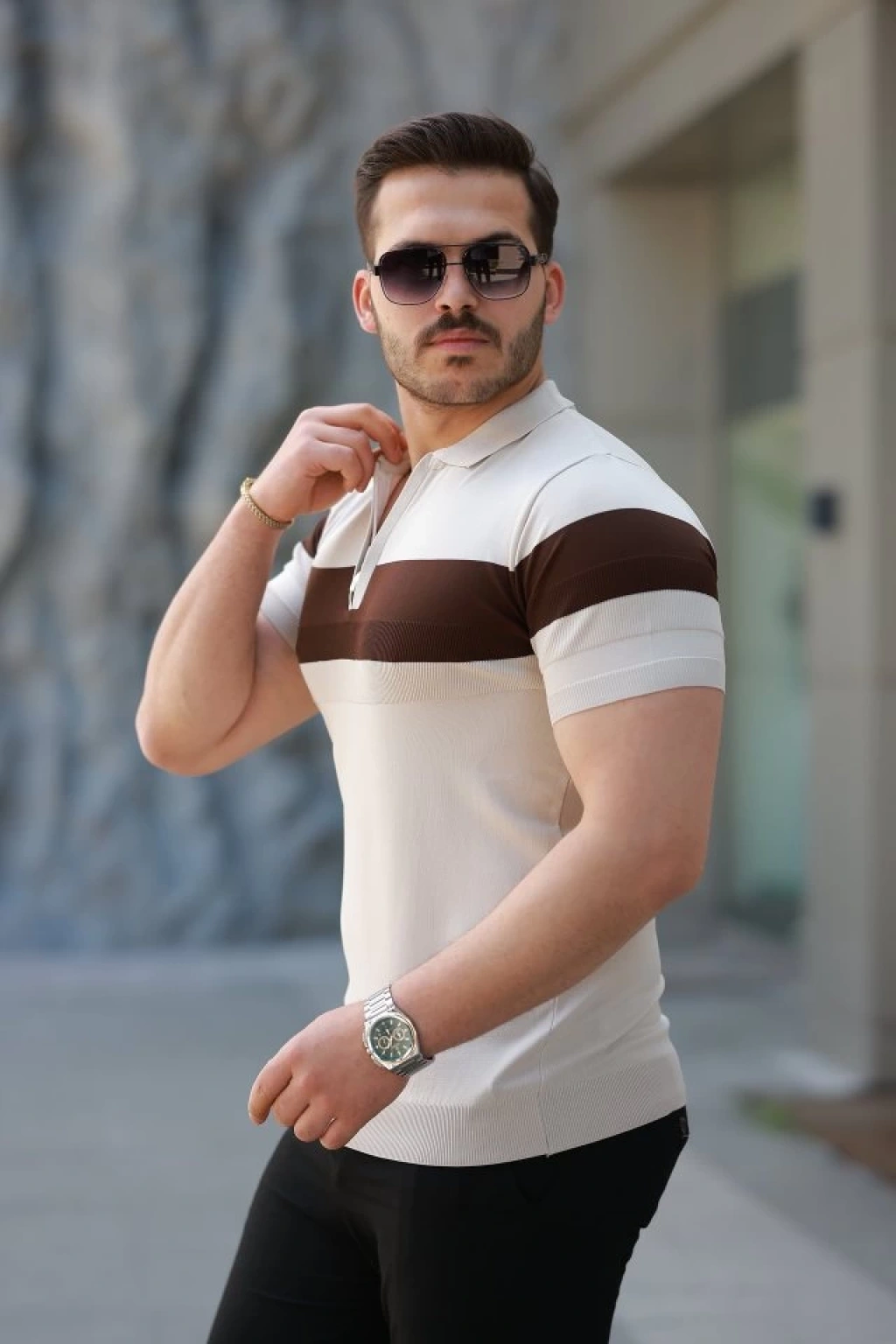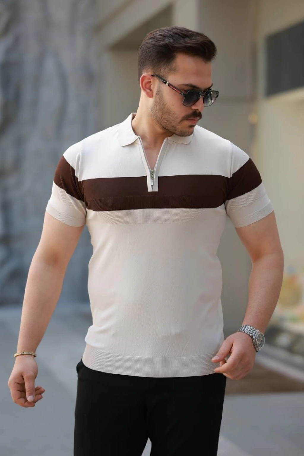 Erkek Fermuar Yakalı şerit Renk Desenli Kısa Kollu Tişört