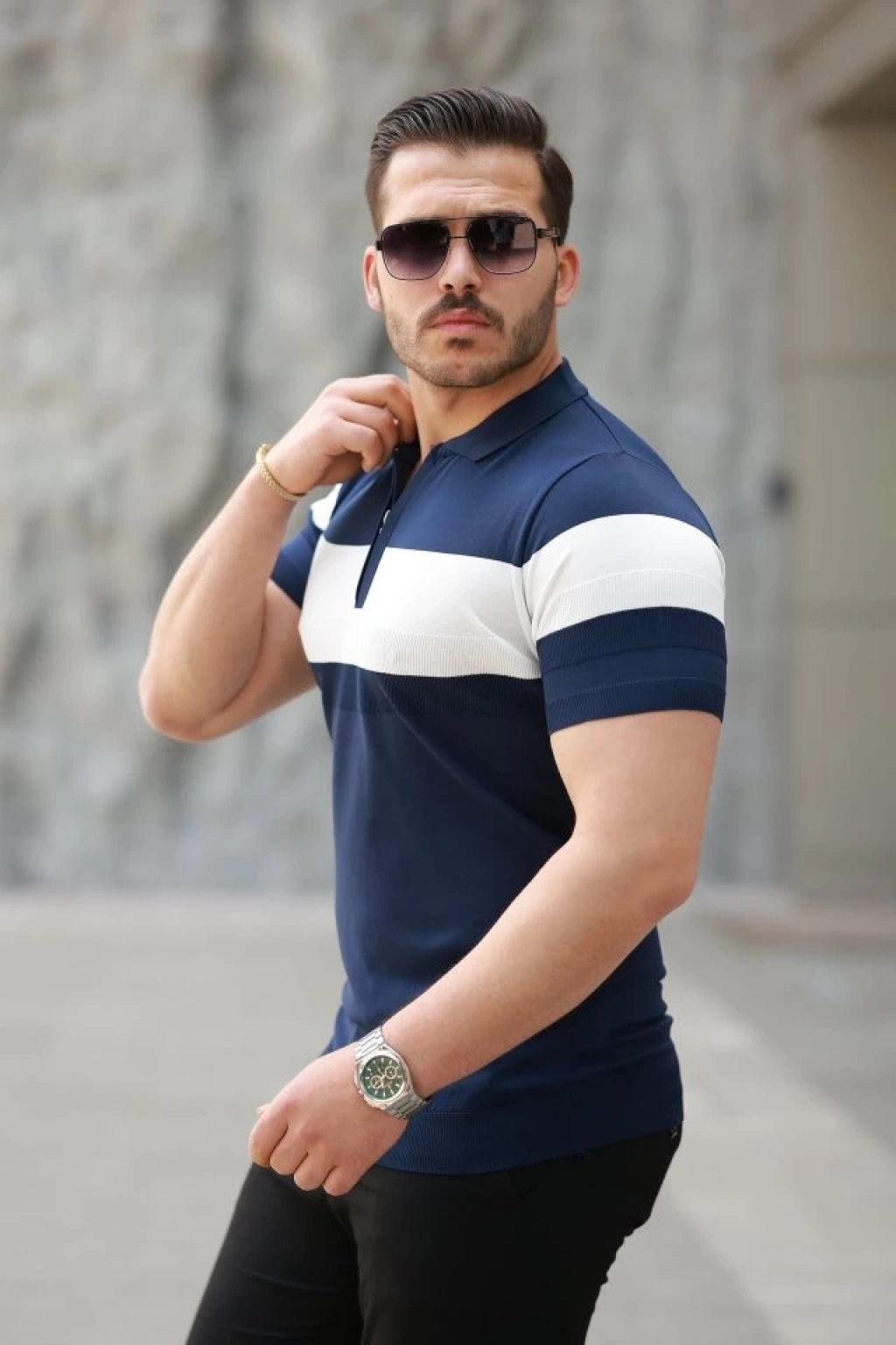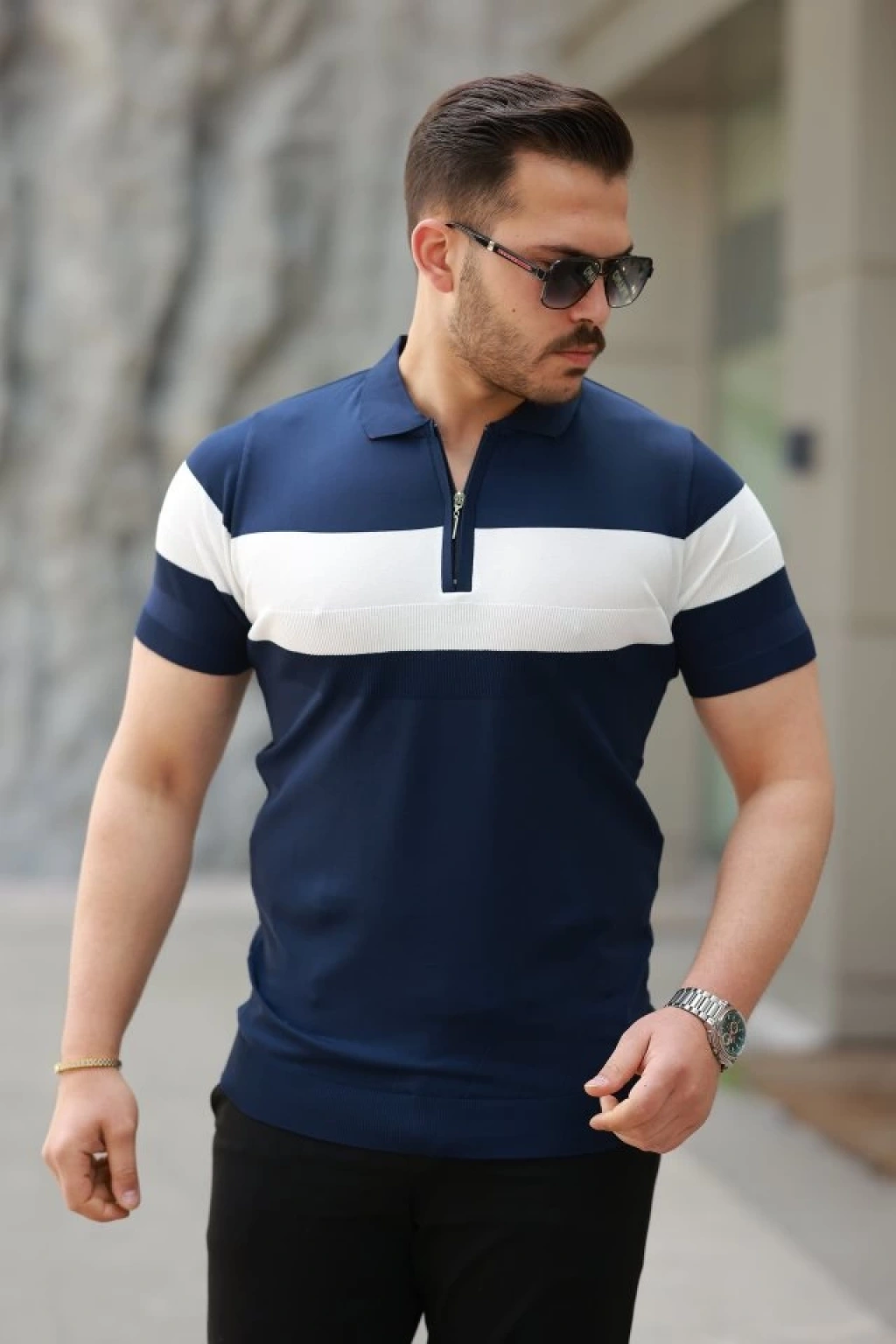 Erkek Fermuar Yakalı şerit Renk Desenli Kısa Kollu Tişört
