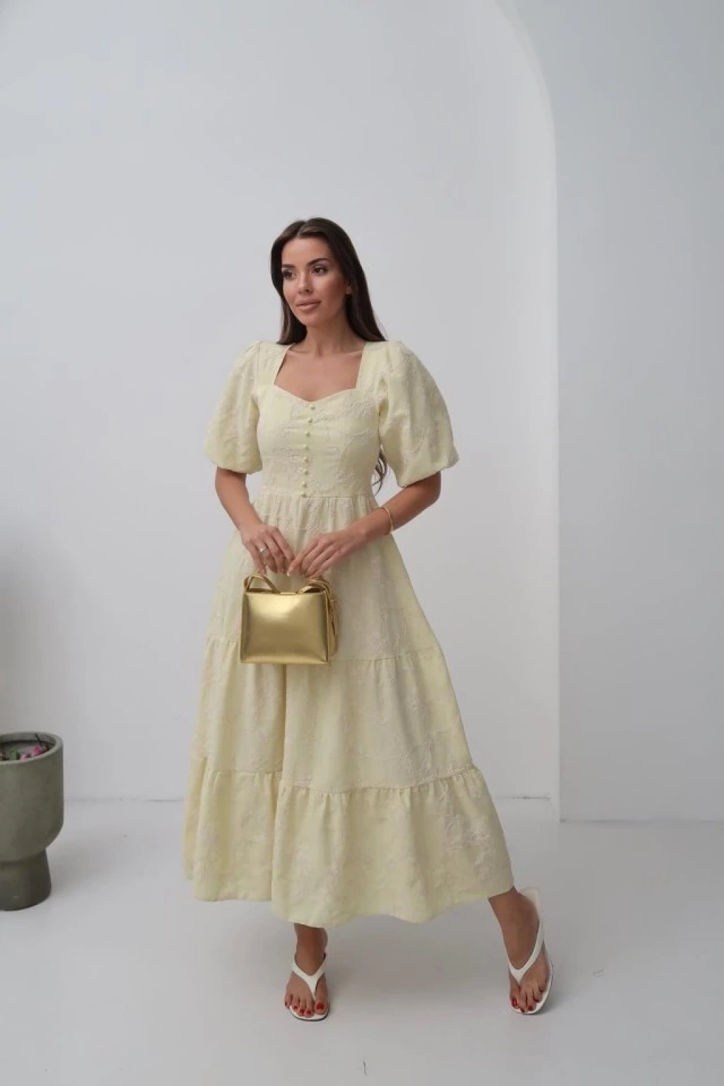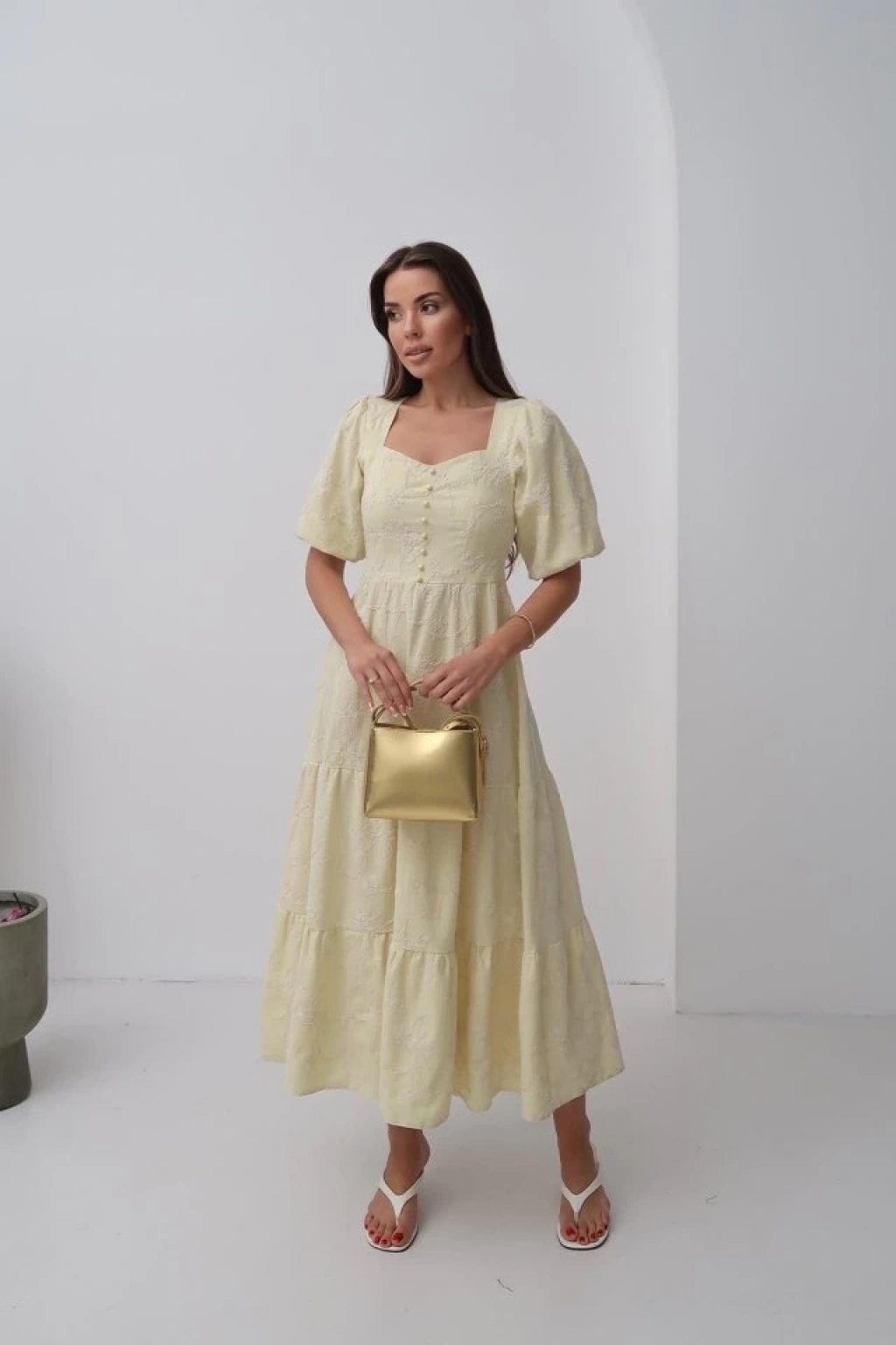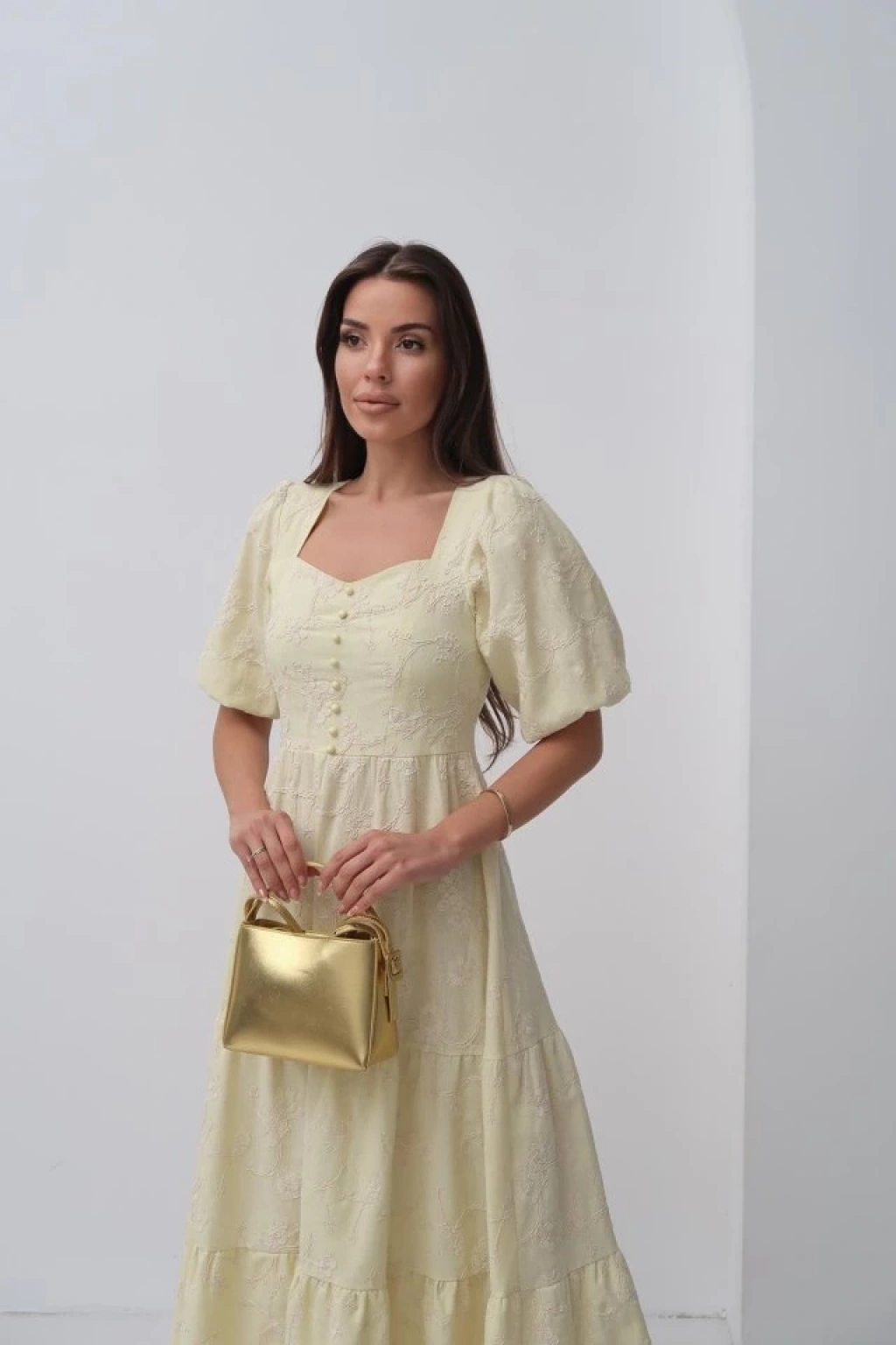 Sarı Süs Düğmeli Balon Kollu Elbise