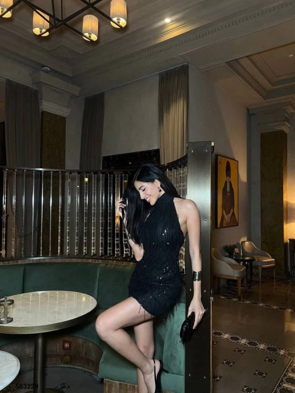 Kadın Pul Payet Kumaş Halter Yaka Mini Elbise