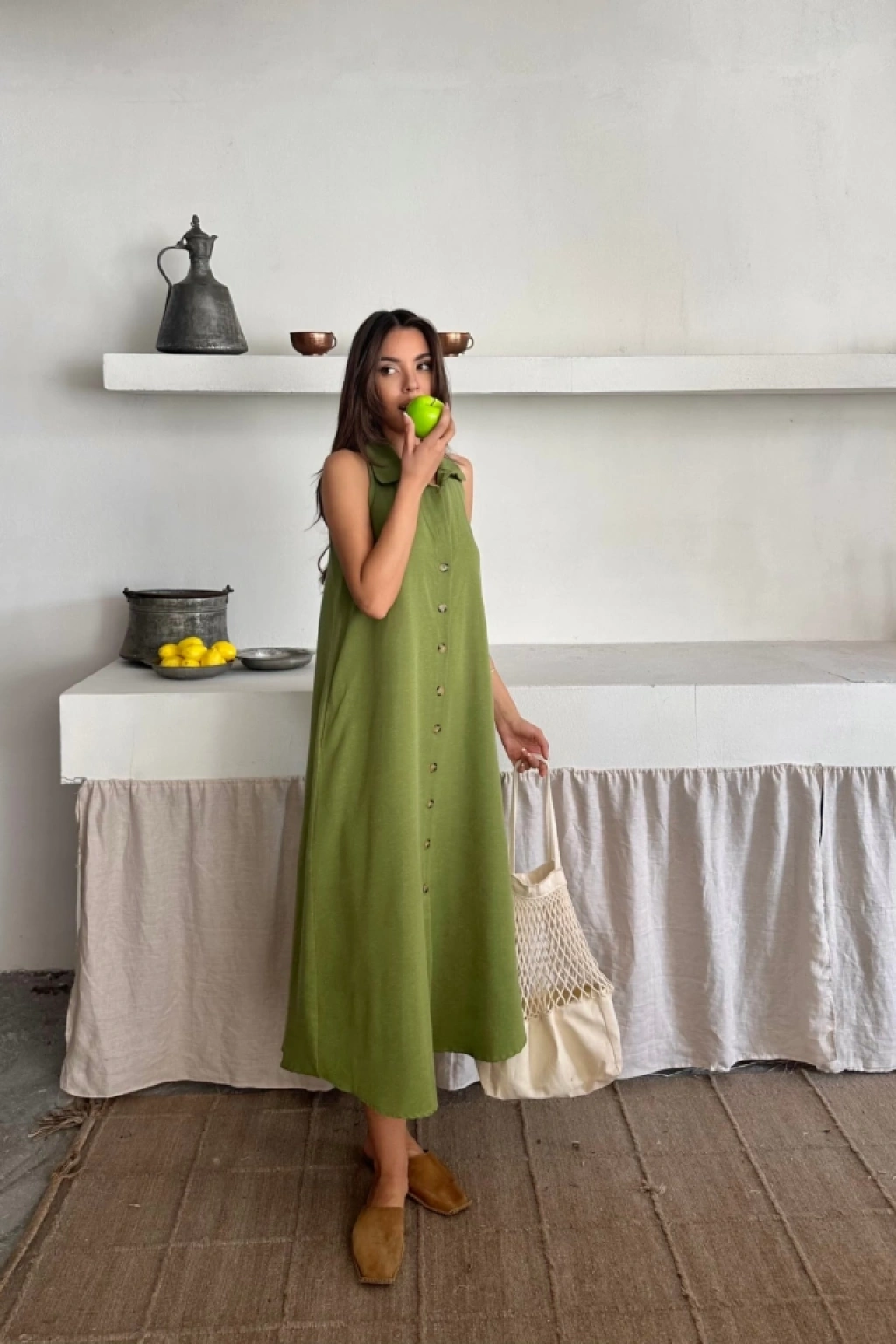 KETEN ÖNDEN DÜĞMELİ KOLSUZ GÖMLEK YAKA ELBİSE - Yağ Yeşili