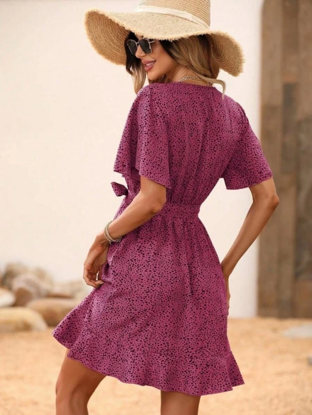 Kadın Kısa Kelebek Kollu Kruvaze Yakalı Belden Kuşaklı Kısa Desenli Süprem Elbise