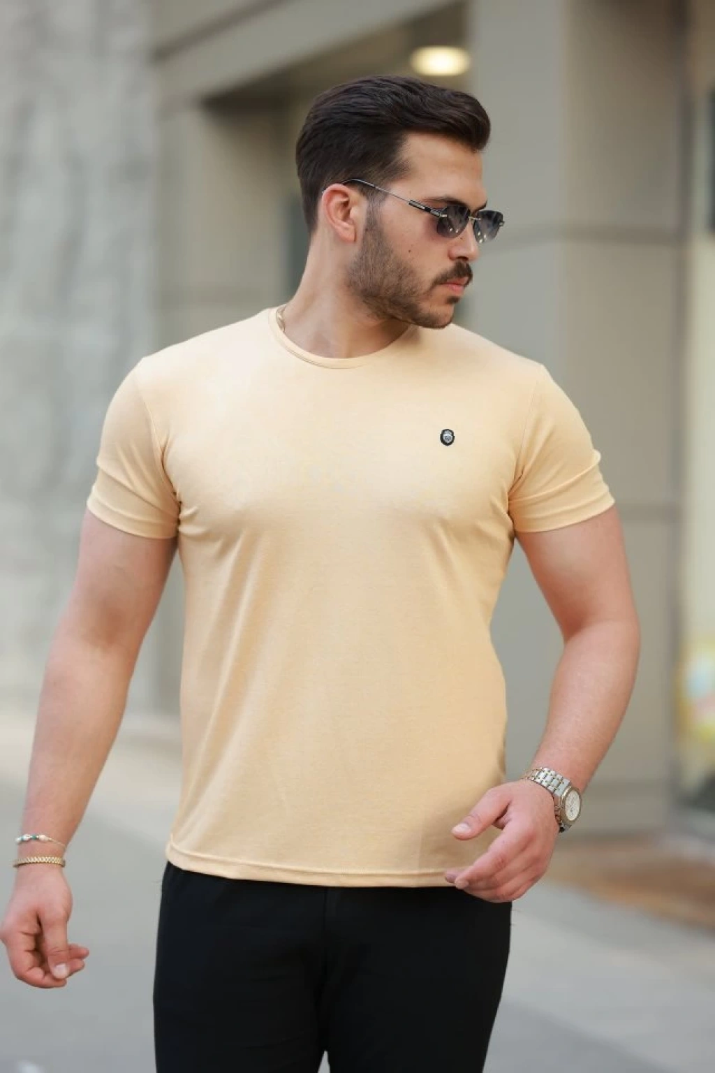 Erkek Bisiklet Yaka Arma Detaylı Basic Kısa Kollu Tişört