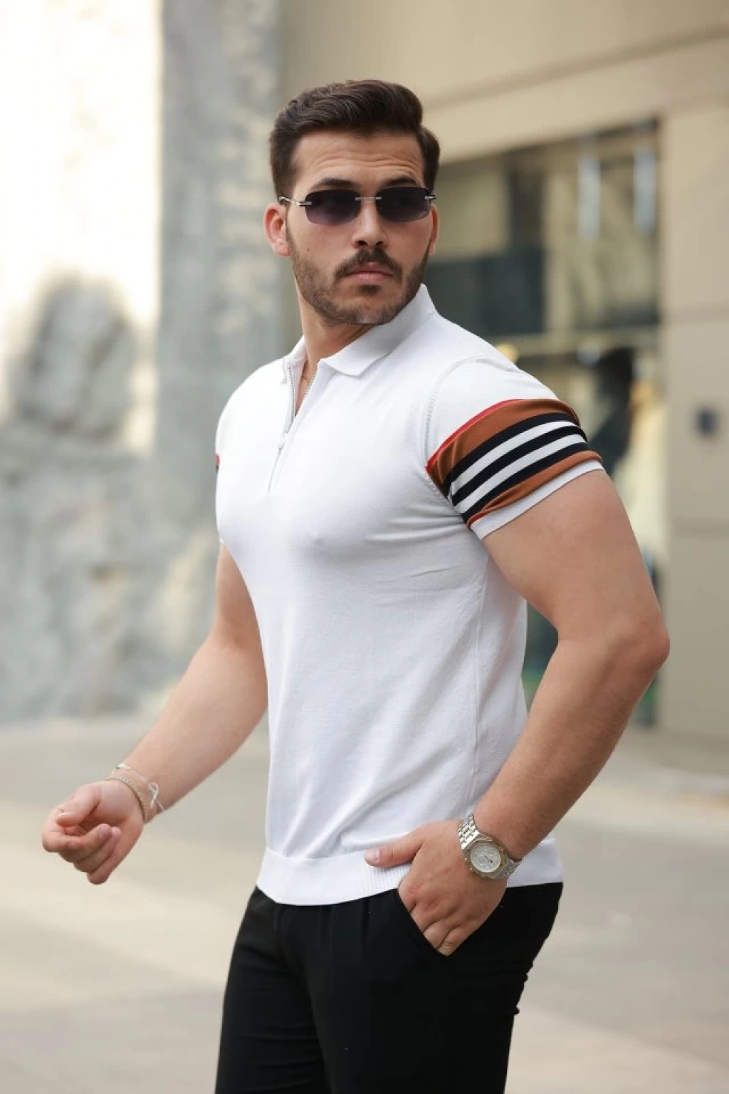 Erkek Fermuar Yakalı Kolları Desenli Kısa Kollu Tişört