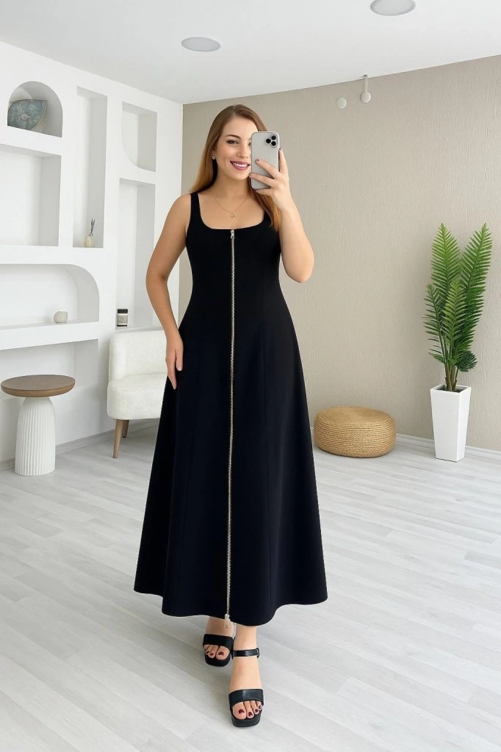 Kadın Askılı Kare Yaka önden Fermuarlı Geniş Kesim Janjan Krep Elbise