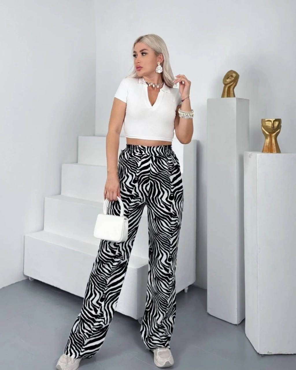 Kadın Desenli Dokuma Viskon Kumaş Cepli Bol Paça Pantolon