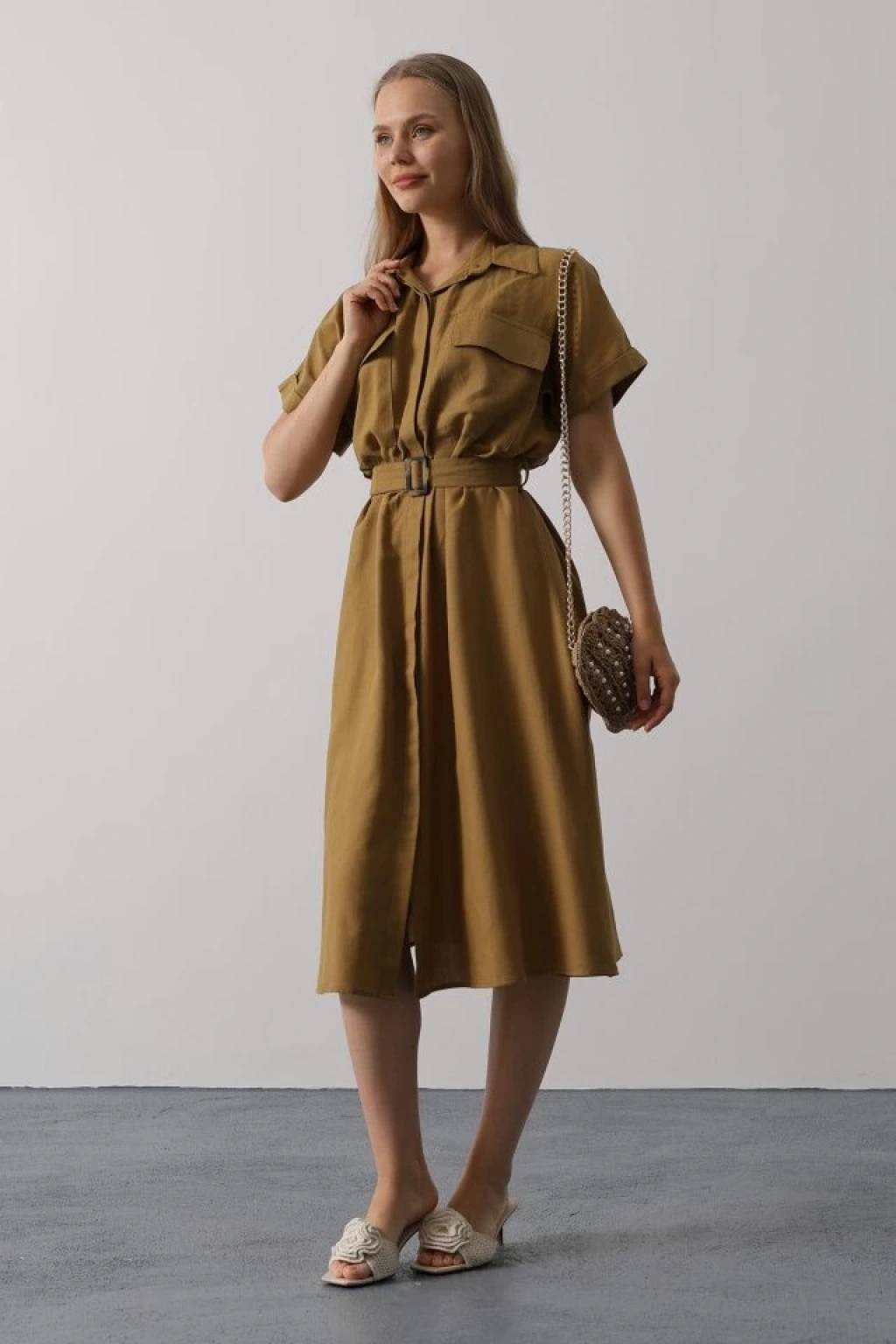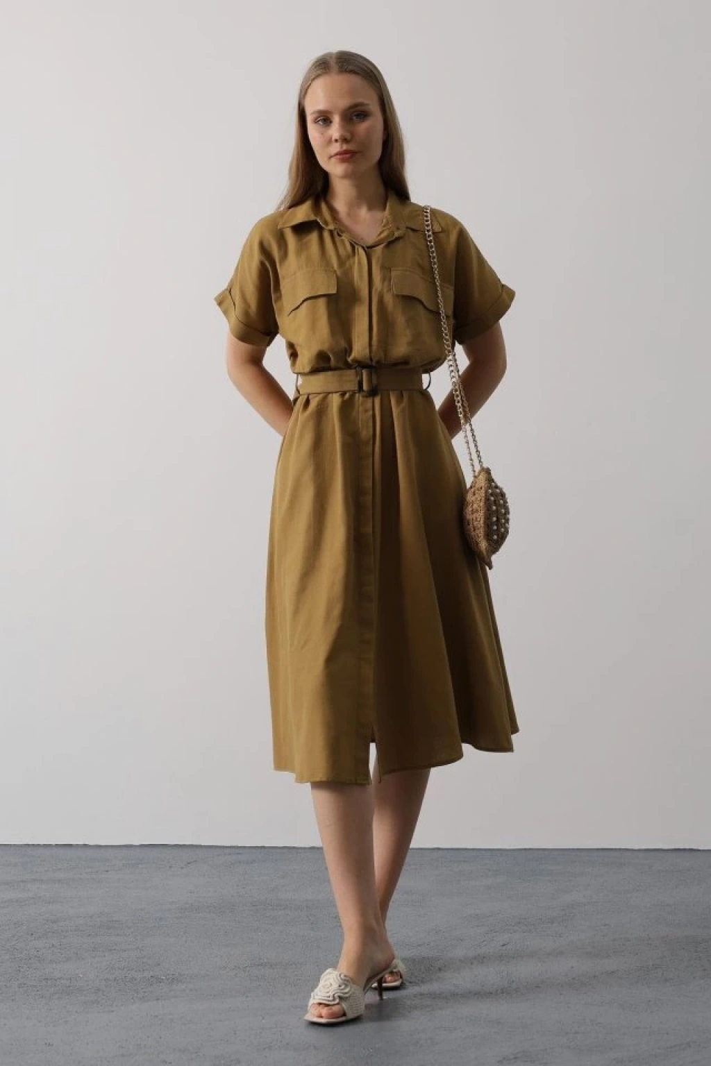 Kuşaklı Cep Detaylı Yarım Kol Elbise - Yağ Yeşili
