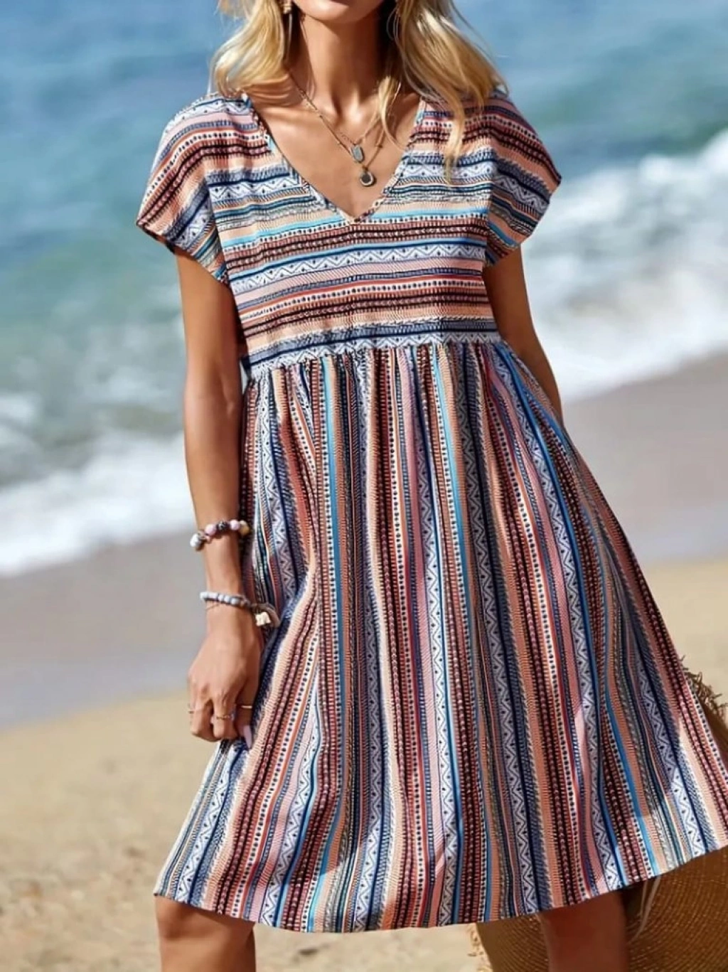 Kadın Kısa Kollu V Yakalı Pile Detay Keten Elbise