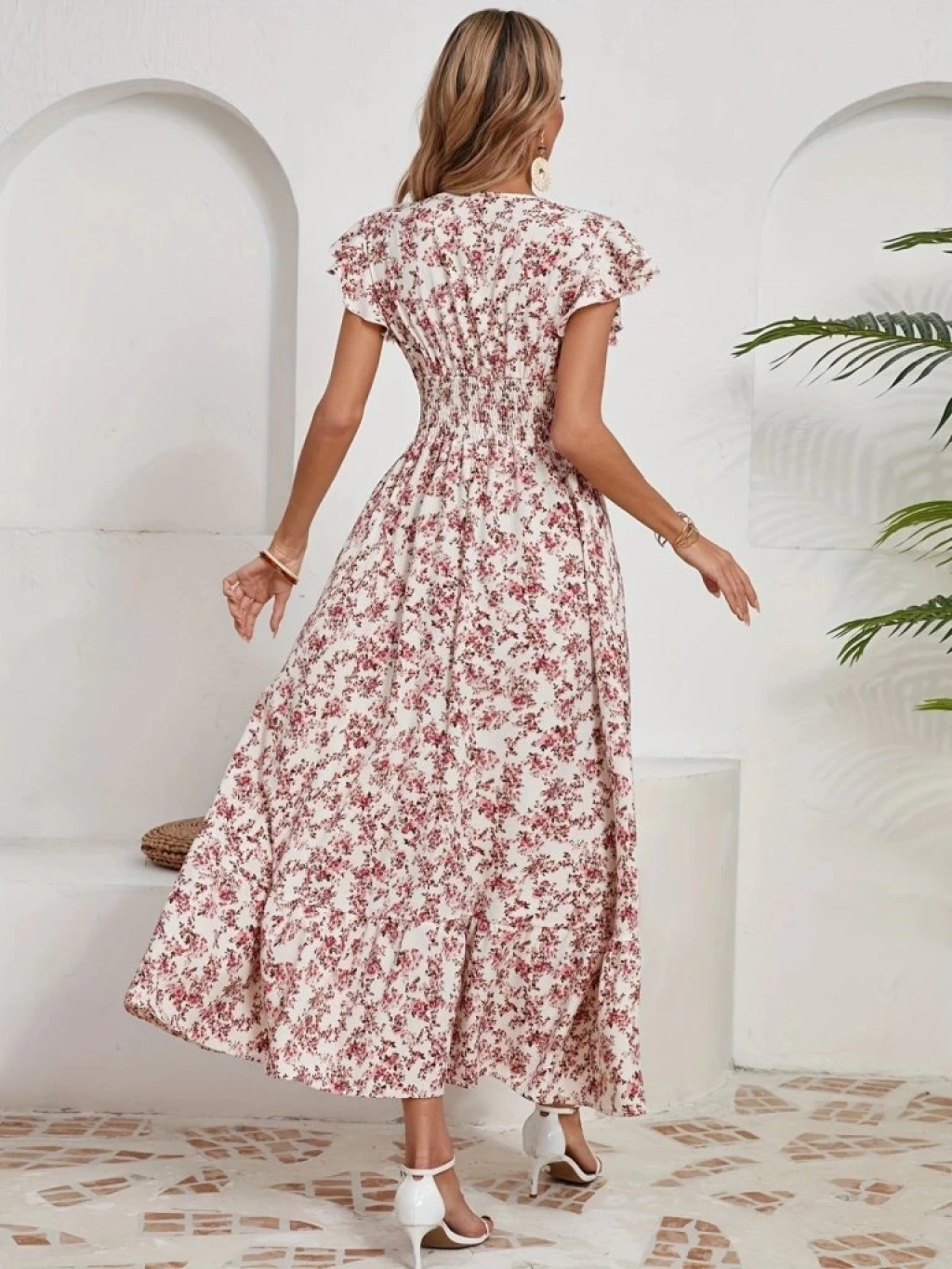 Kadın Kısa Kollu Kruvaze Yaka Beli Lastikli çiçek Desenli Elbise