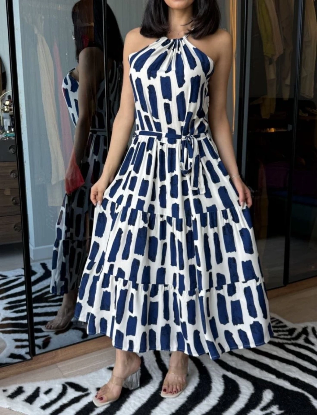 Kadın Viskon Kumaş Ip Askılı Halter Yaka Cepli Midi Boy Elbise