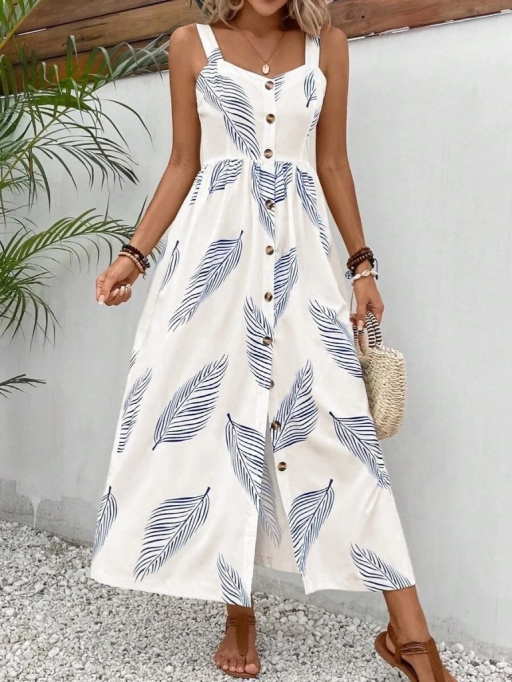 Kadın Askılı önden Düğmeli Yaprak Desenli Uzun Süprem Elbise