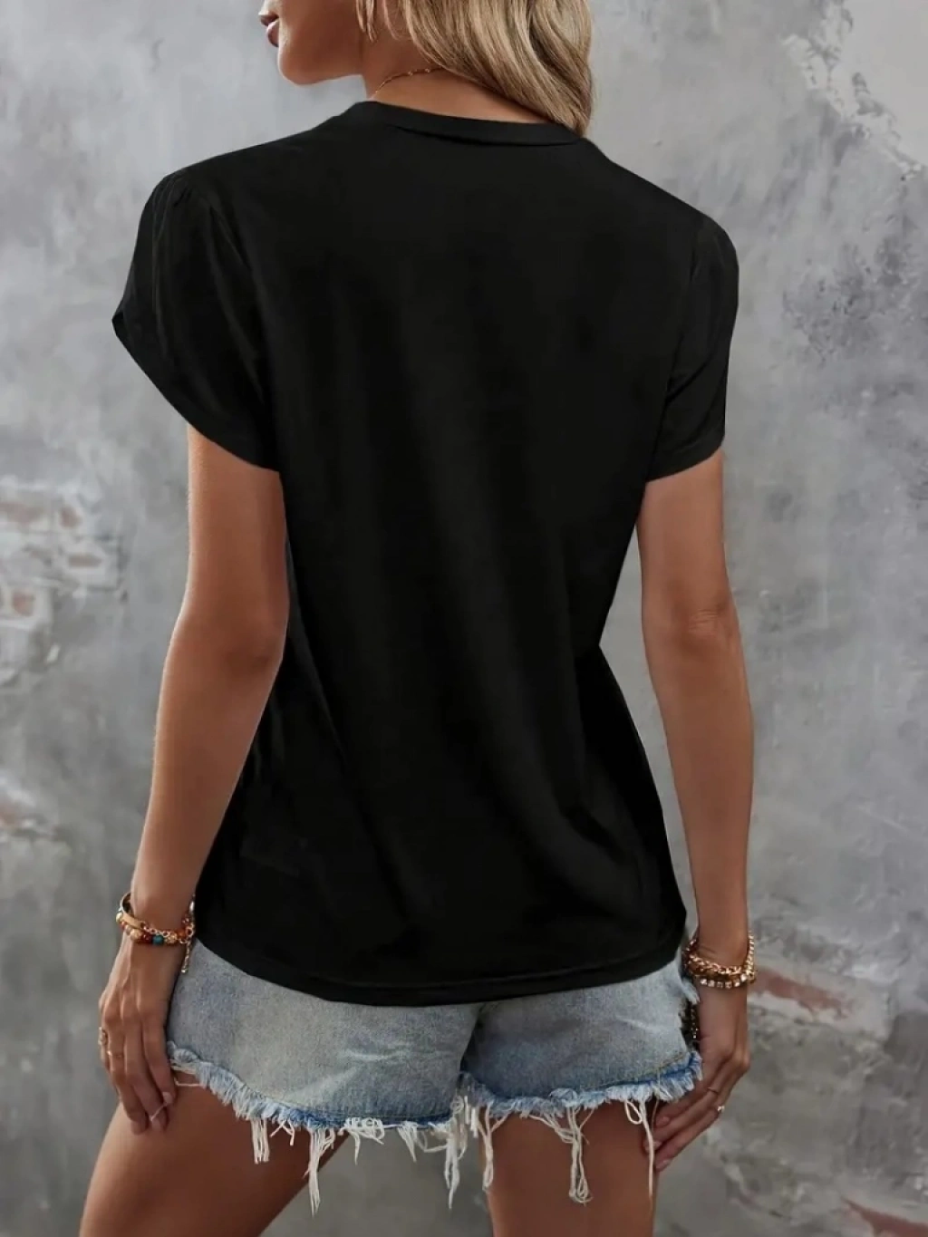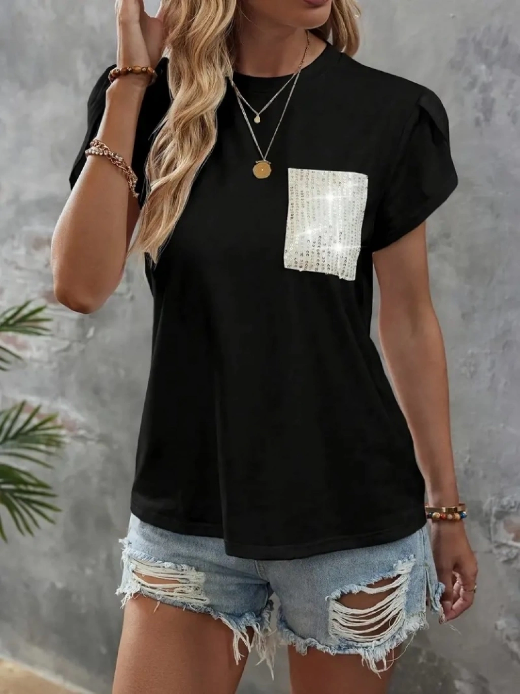 Kadın Kısa Kollu Bisiklet Yaka Cep Pul Payet Detay Viskon Bluz