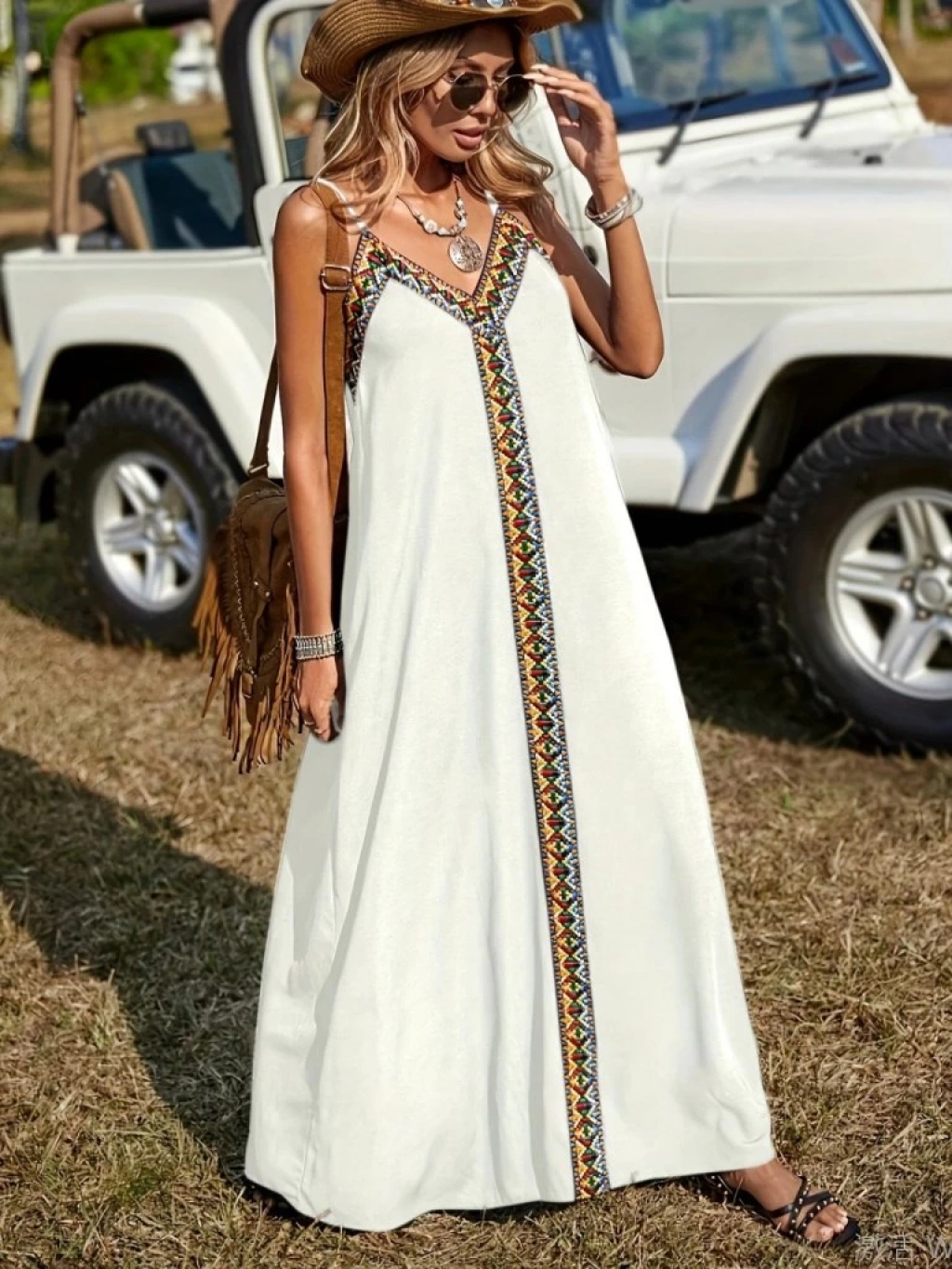 Kadın Askılı V Yakalı Etnik şerit Detaylı Uzun Viskon Elbise