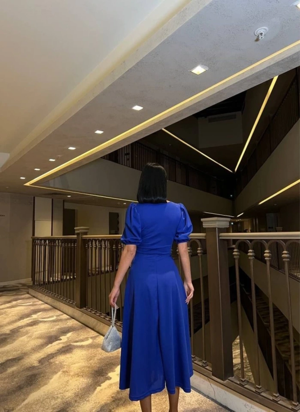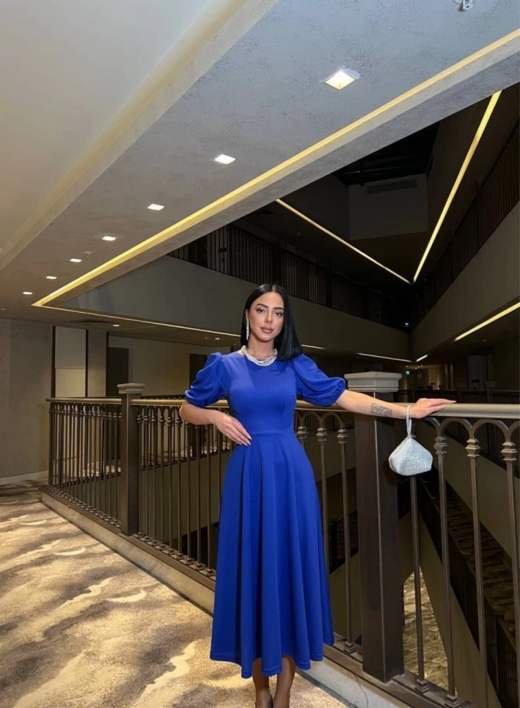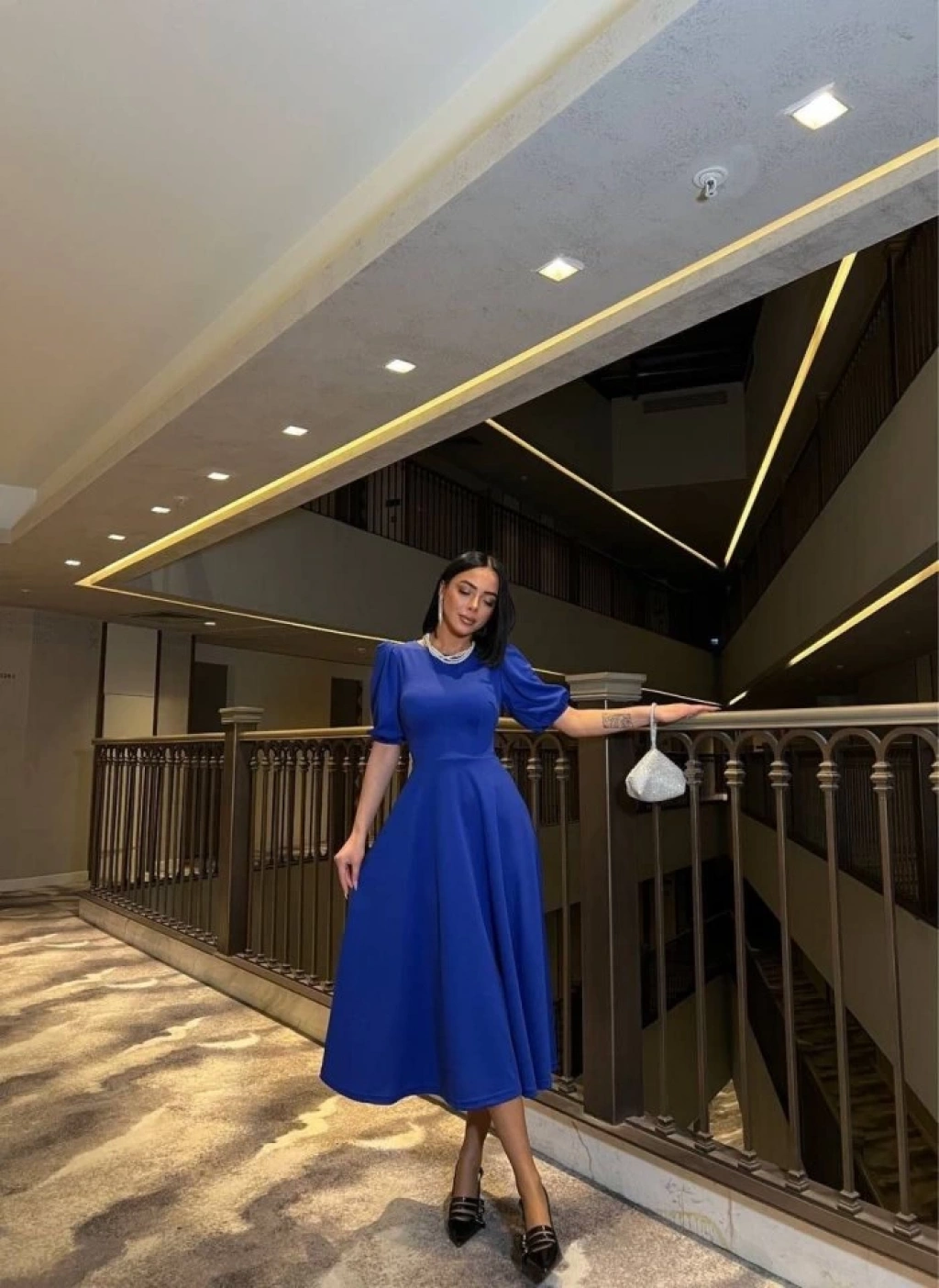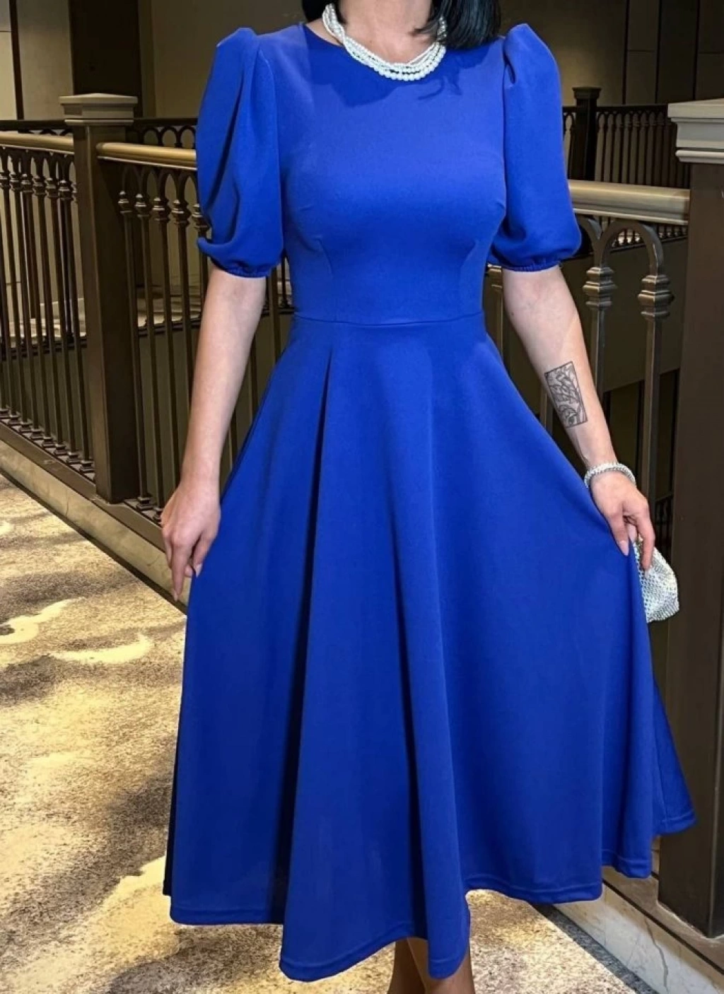 Kadın Bisiklet Yaka Kısa Kol Lastik Detay Uzun Elbise