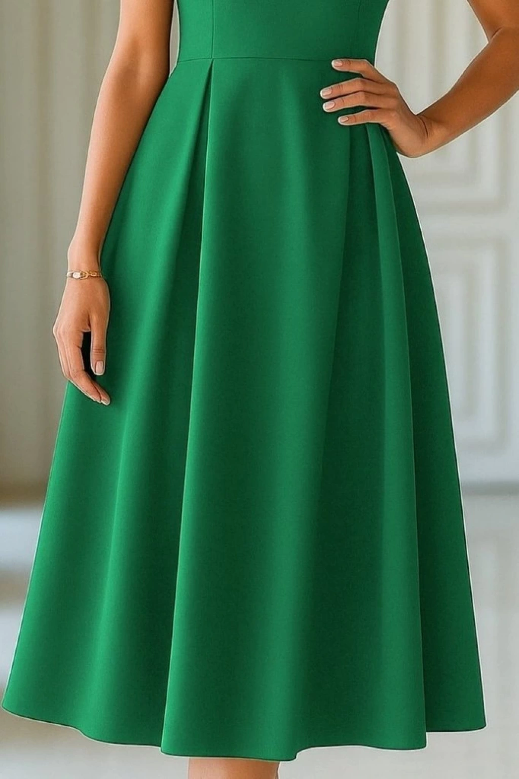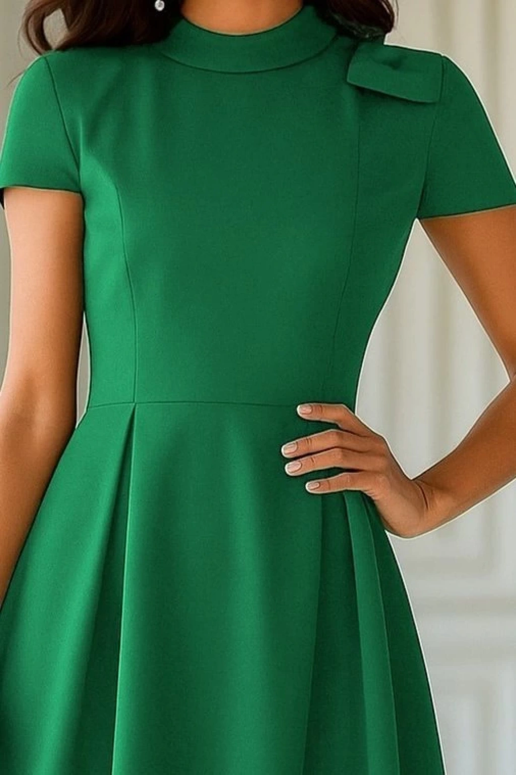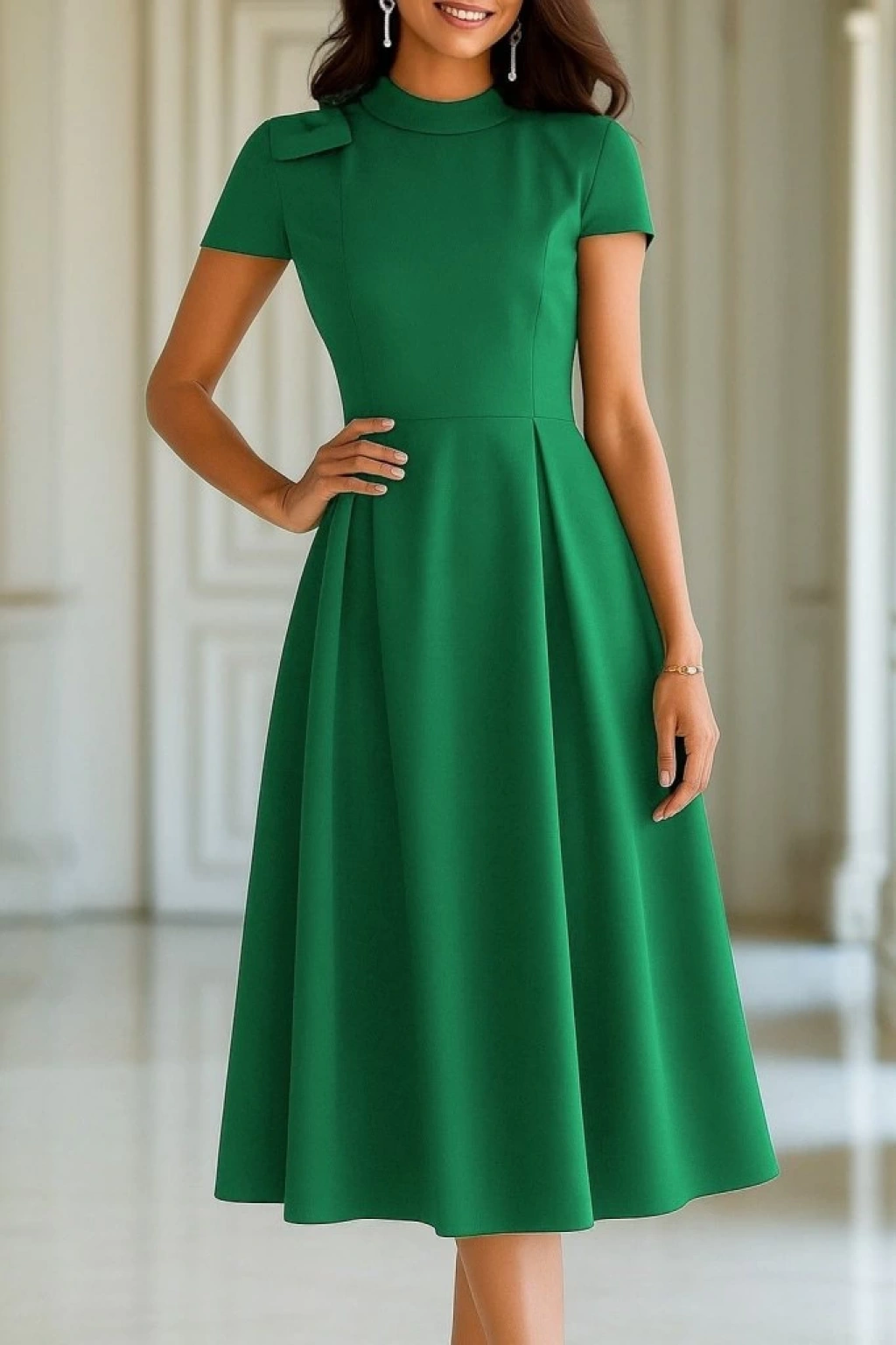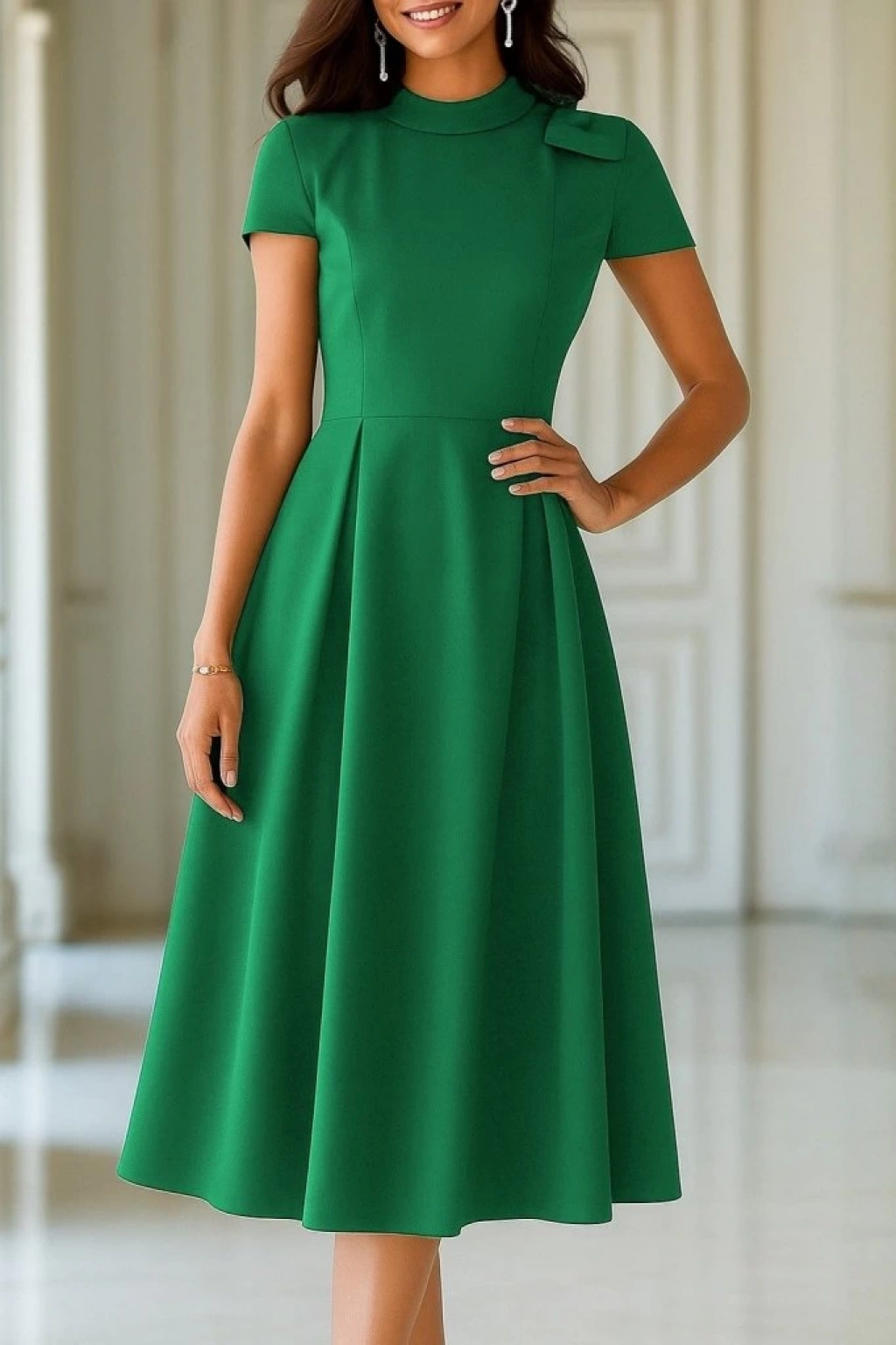 Kadın Kısa Kollu Yarı Balıkçı Yaka Pileli Janjan Krep Midi Elbise