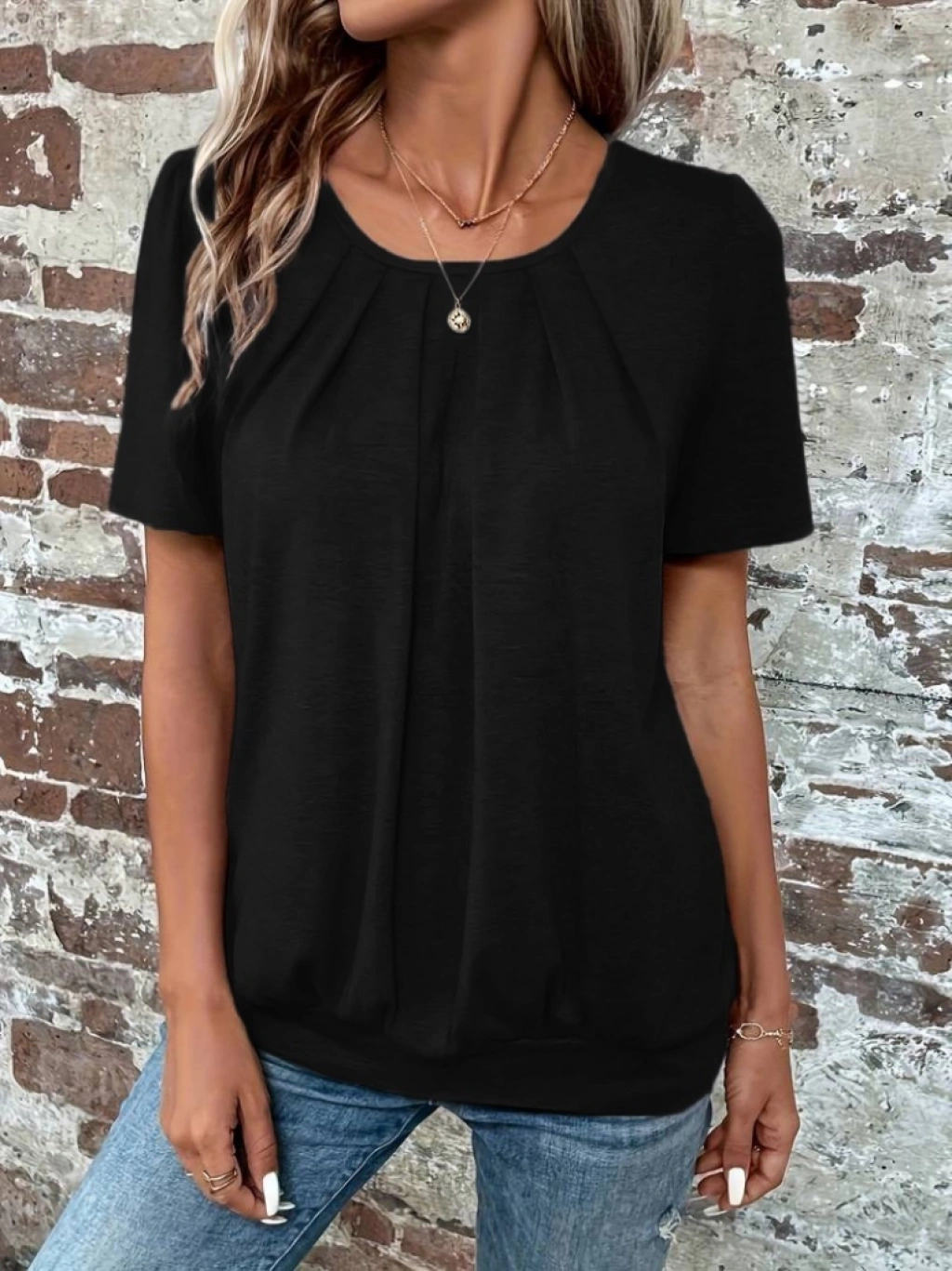 Kadın Kısa Kollu Yuvarlak Yaka önden Pileli Salaş Viskon Bluz