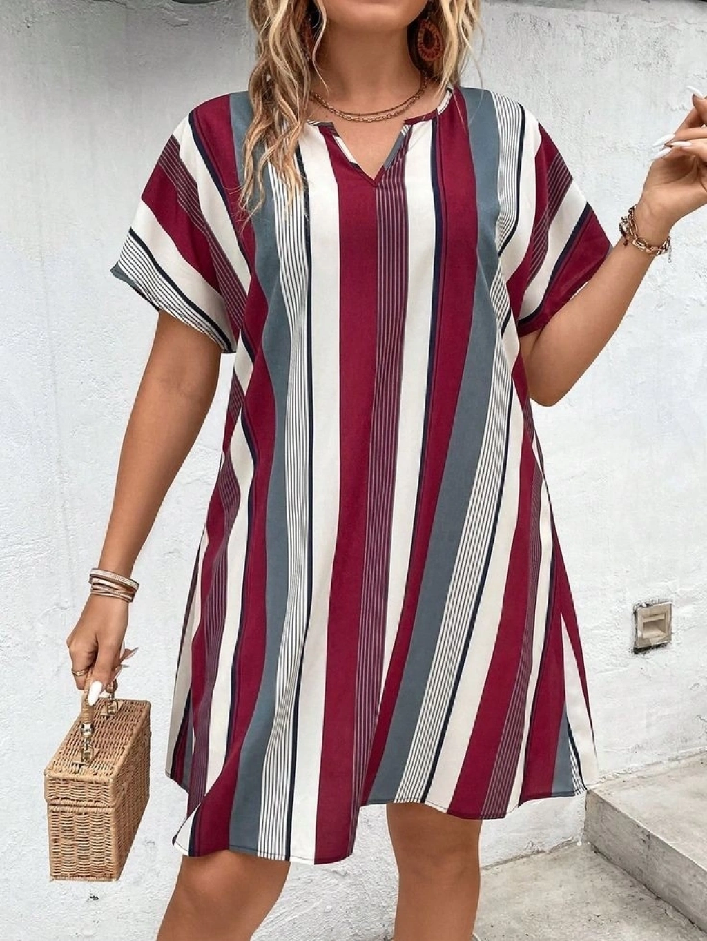 Kadın Kısa Kollu V Yakalı çizgi Baskılı Süprem Elbise
