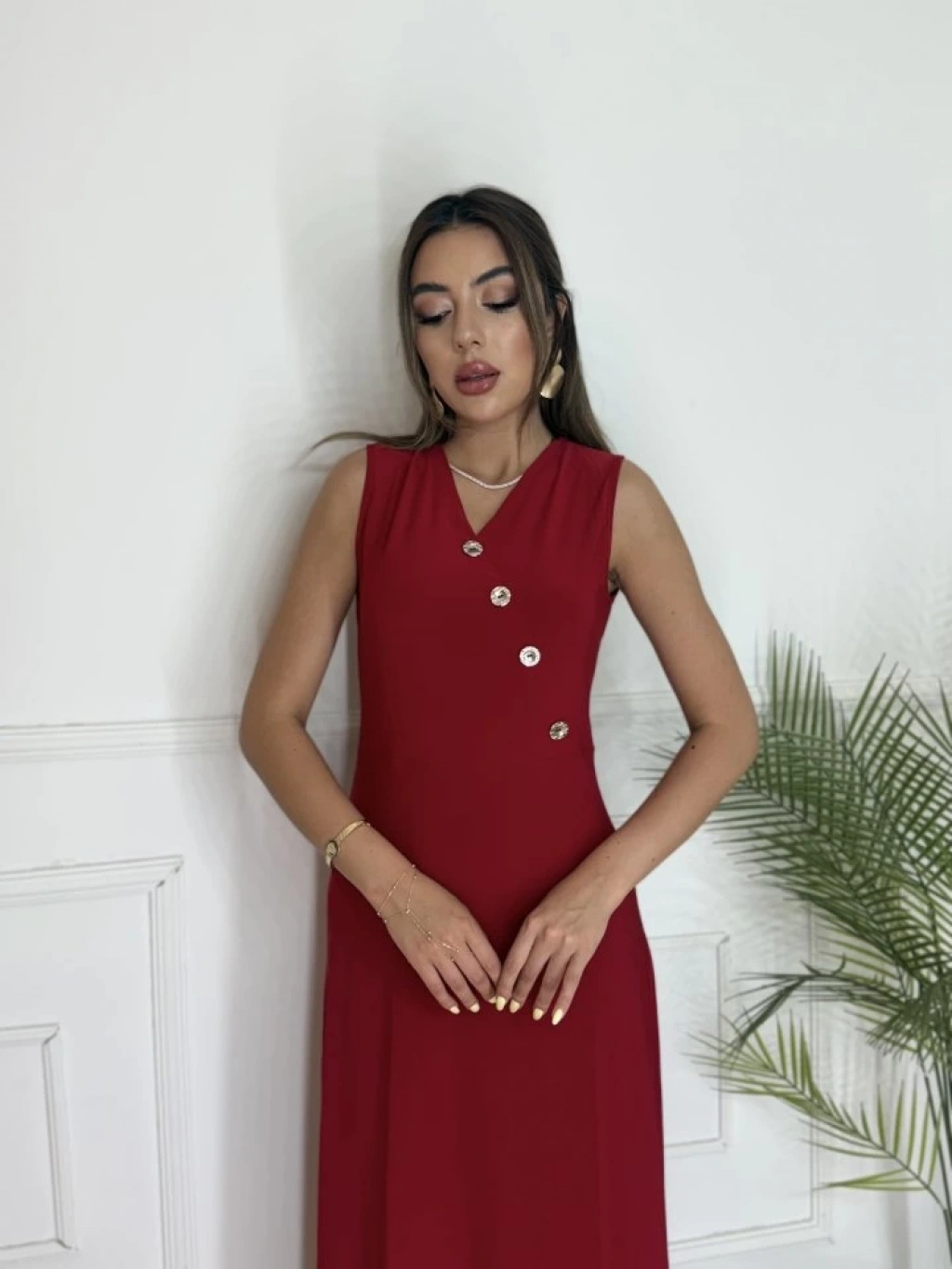 Kadın Düğme Detay Kolsuz Maxi Boy Elbise