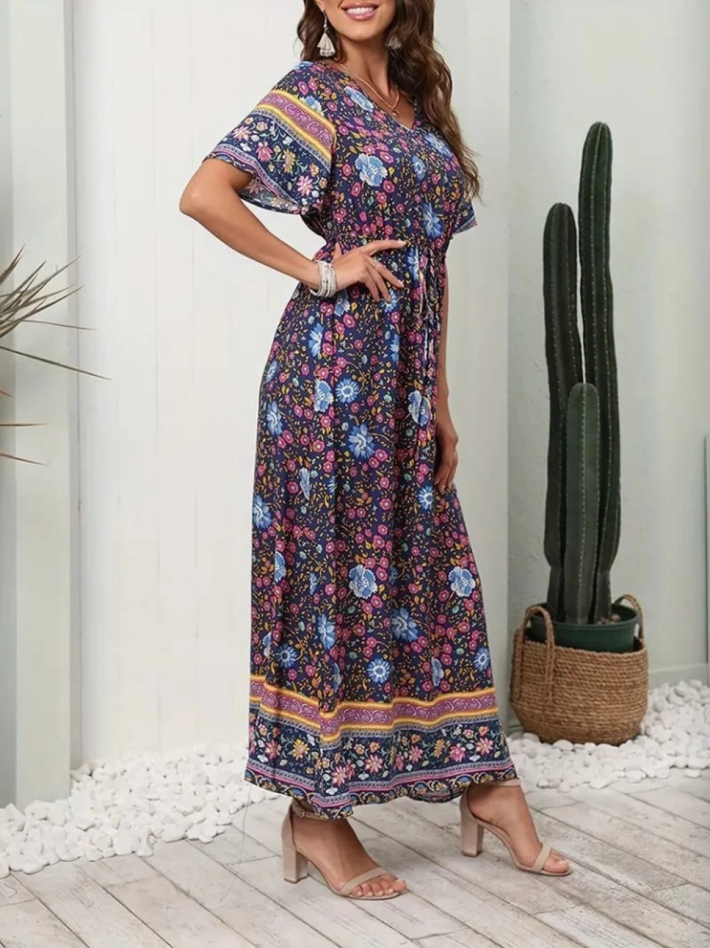 Kadın Kısa Kollu Beli Lastikli çiçek Desen Tam Boy Elbise