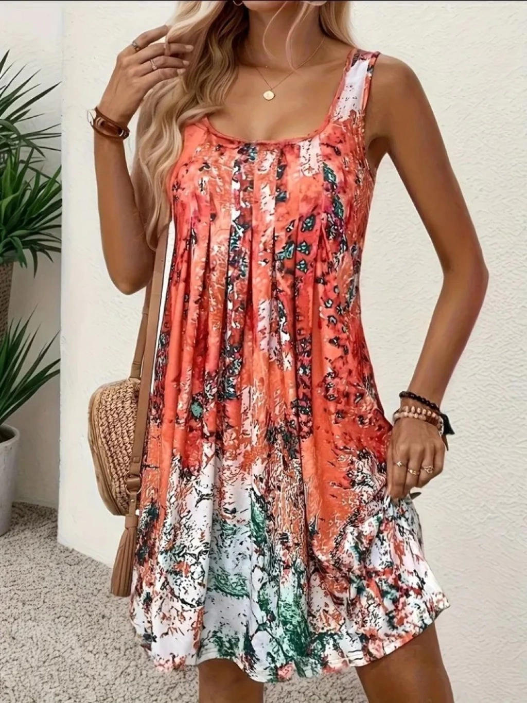 Kadın Sıfır Kollu Kare Yaka önden Pileli Salaş Süprem Elbise