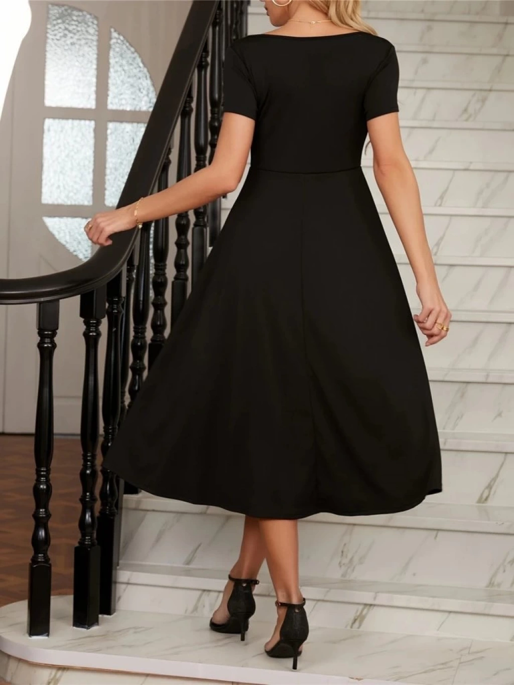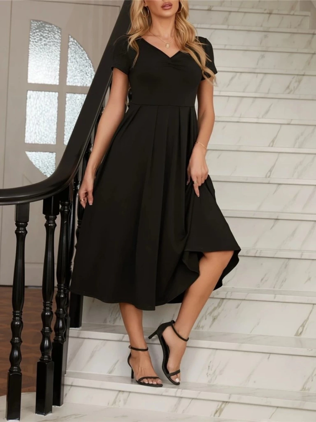Kadın Kısa Kollu V Yakalı önden Pileli Midi Janjan Krep Elbise