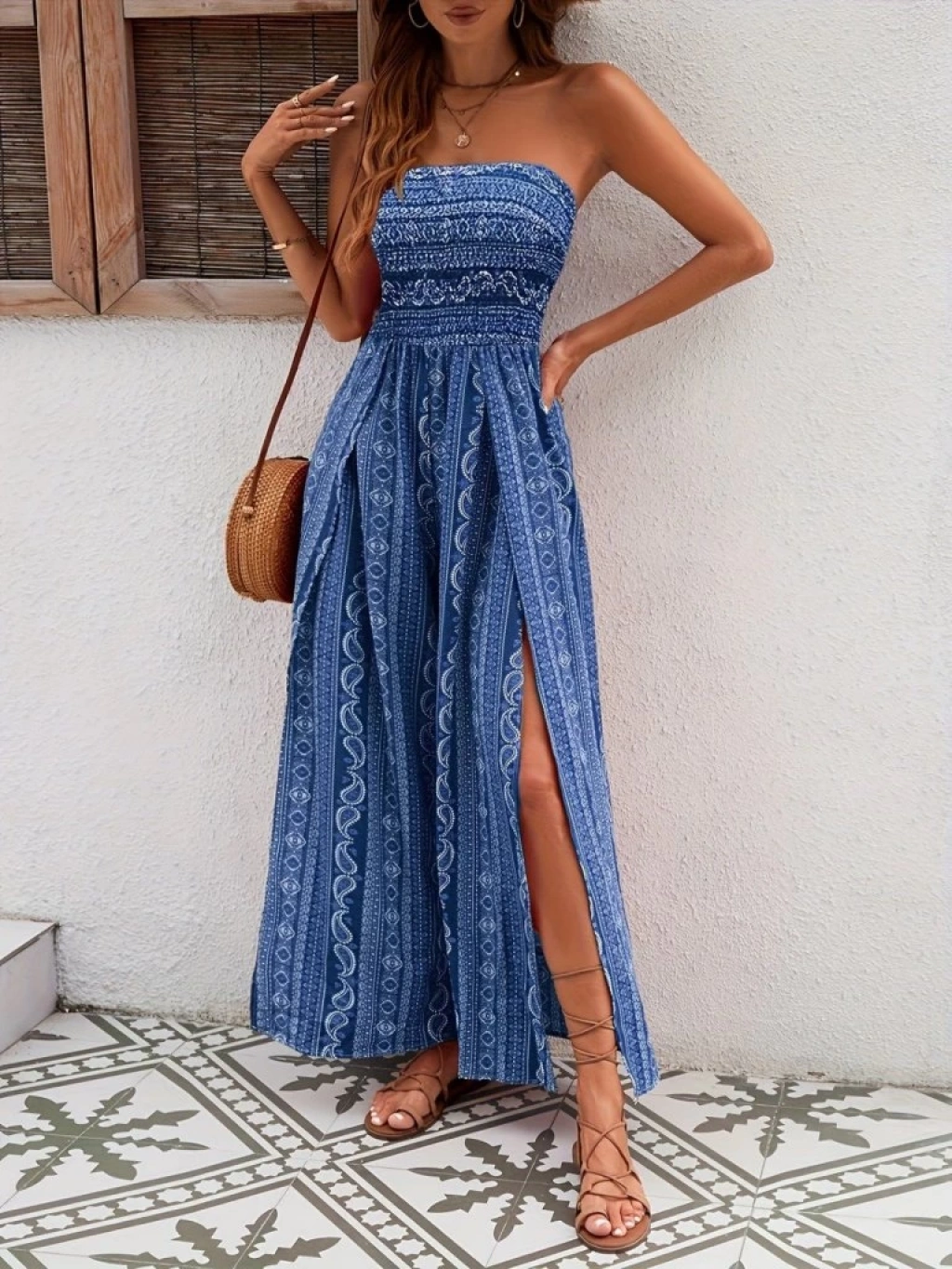 Kadın Yakası Gipe Detaylı önden Yırtmaç Detaylı Desenli Süprem Pantolunetek Tulum