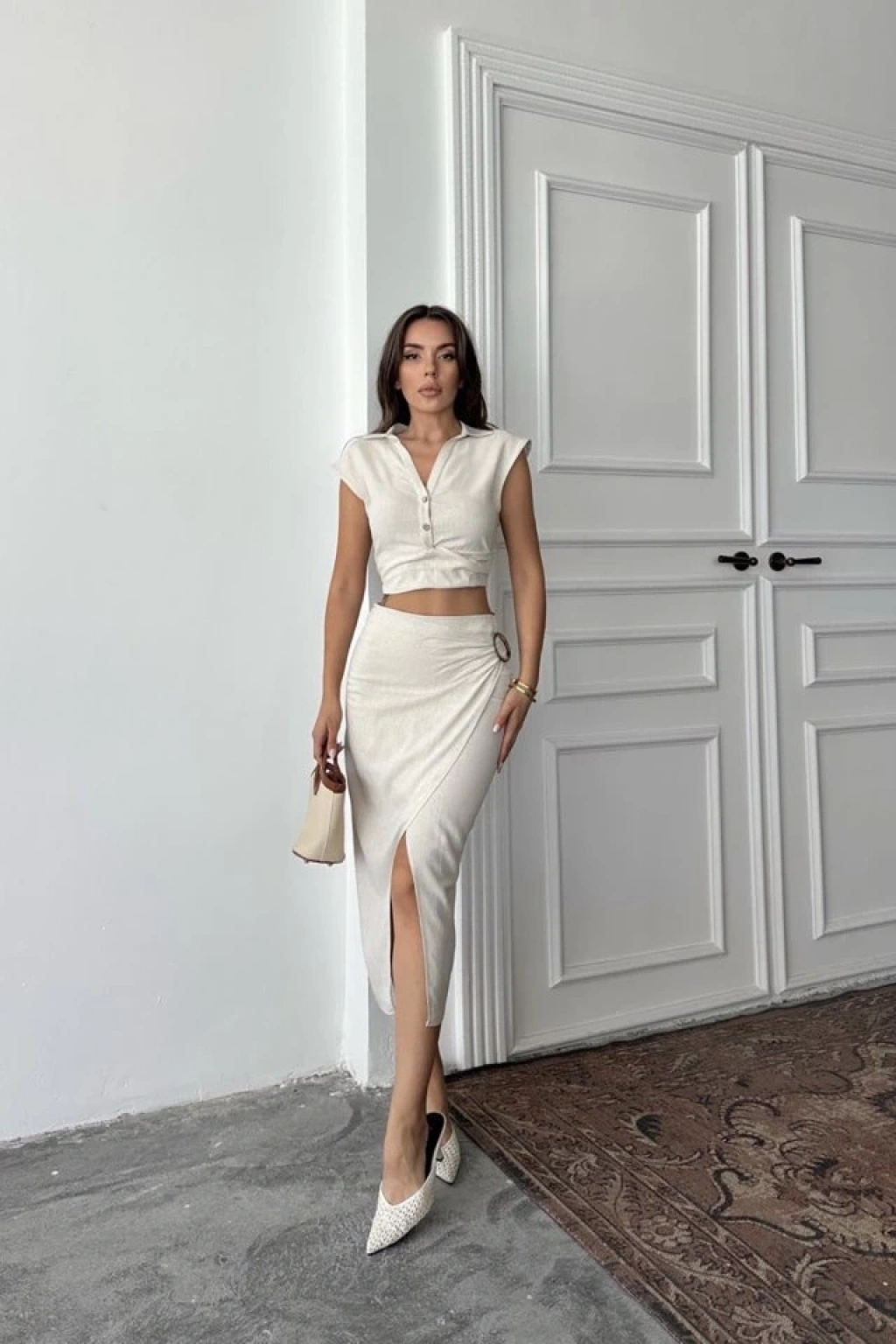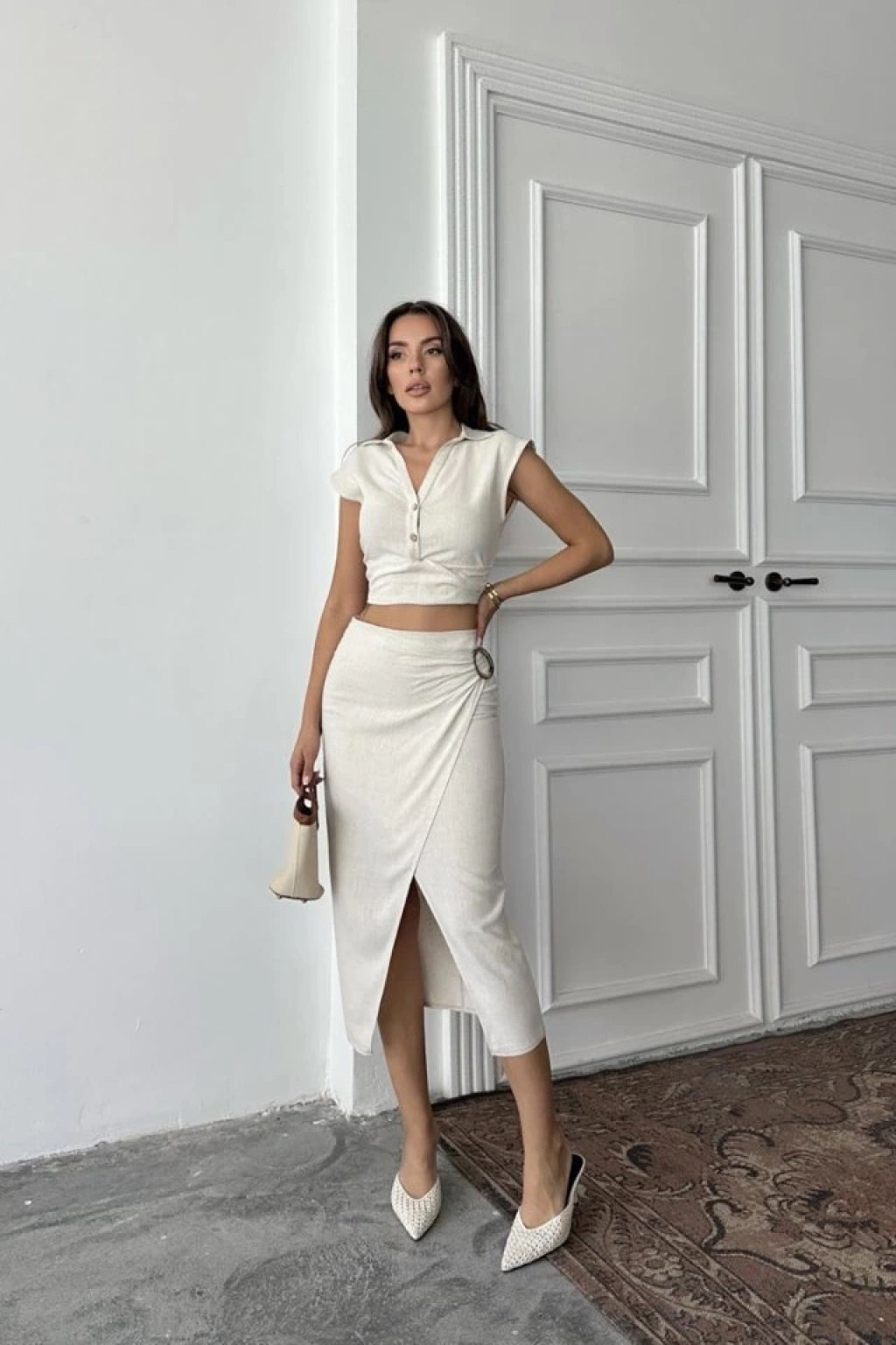 Bej Keten Gömlek Ve Etek Takım