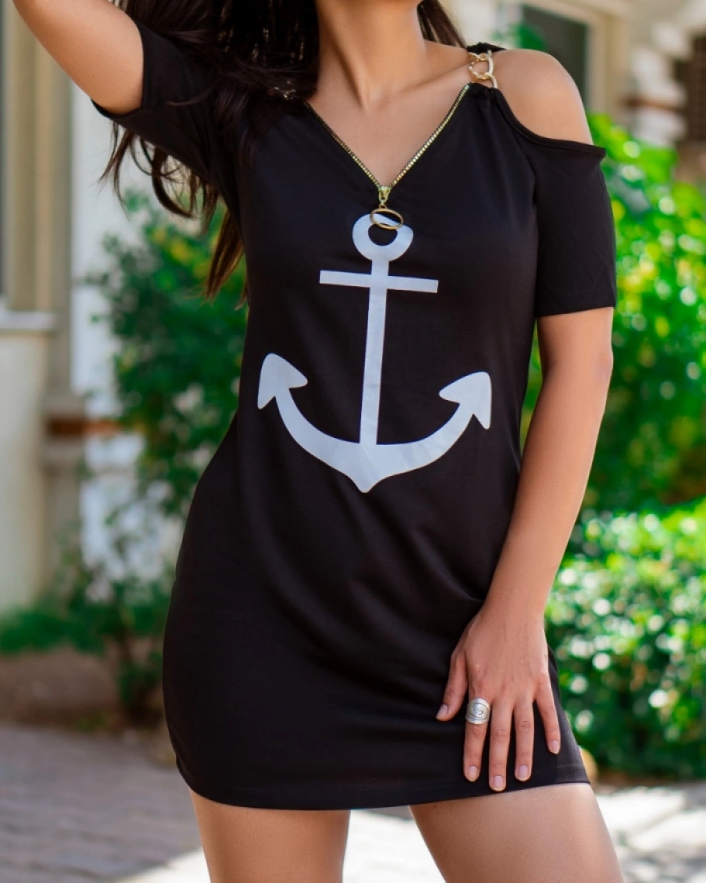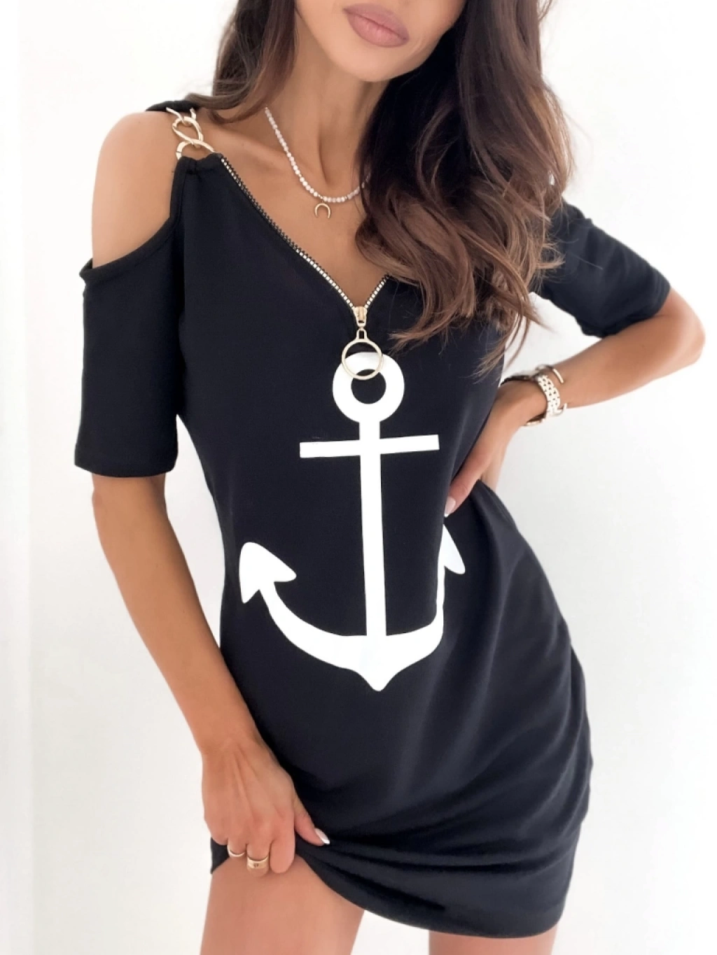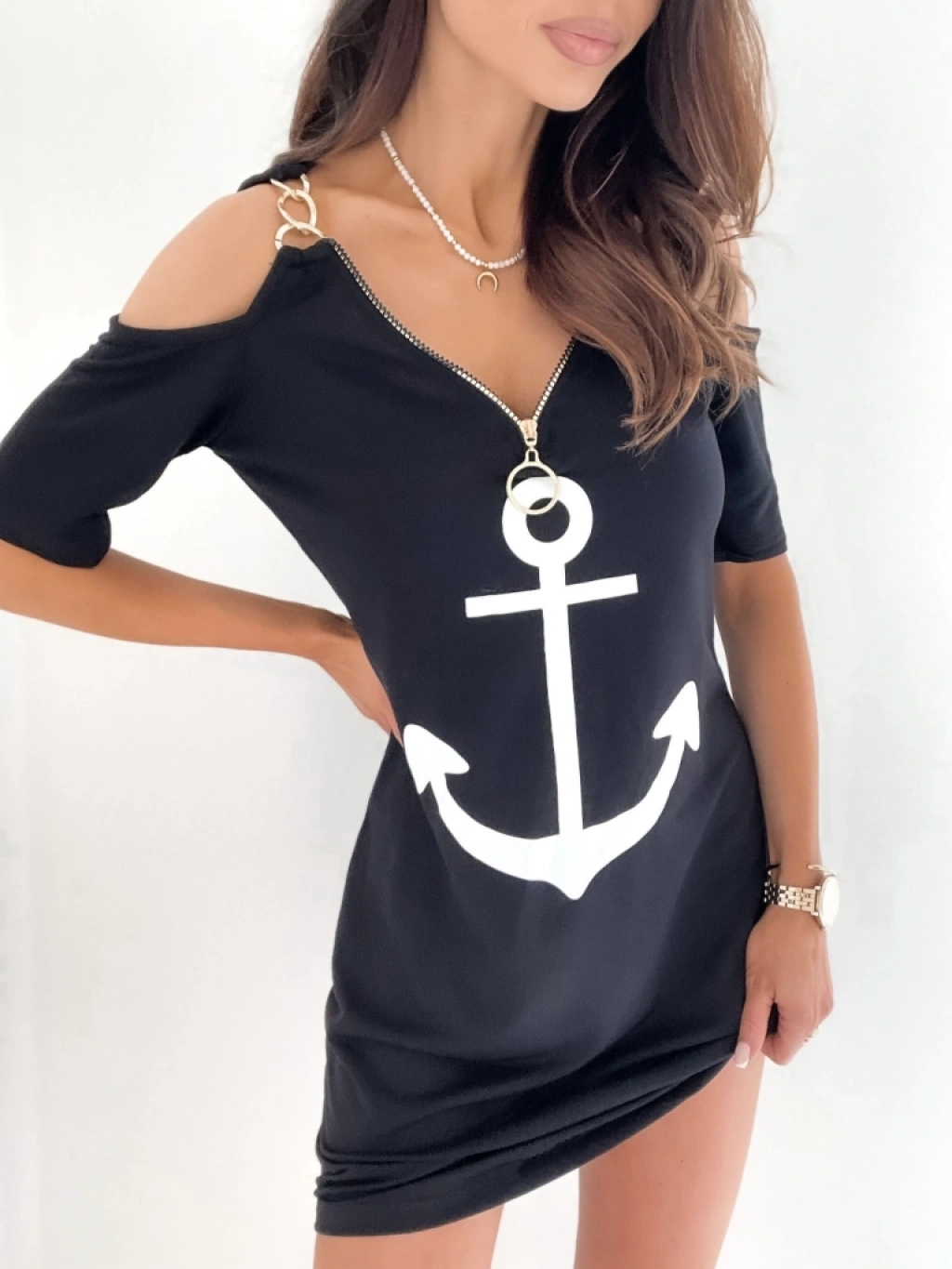 Fermuar Detay çıpa Baskılı Zincir Askılı Viskon Elbise