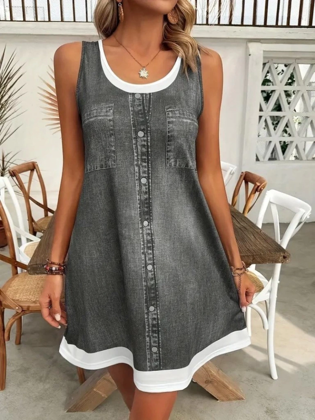 Kadın Askılı Yuvarlak Yakalı Kot Görünümlü Kısa Süprem Elbise