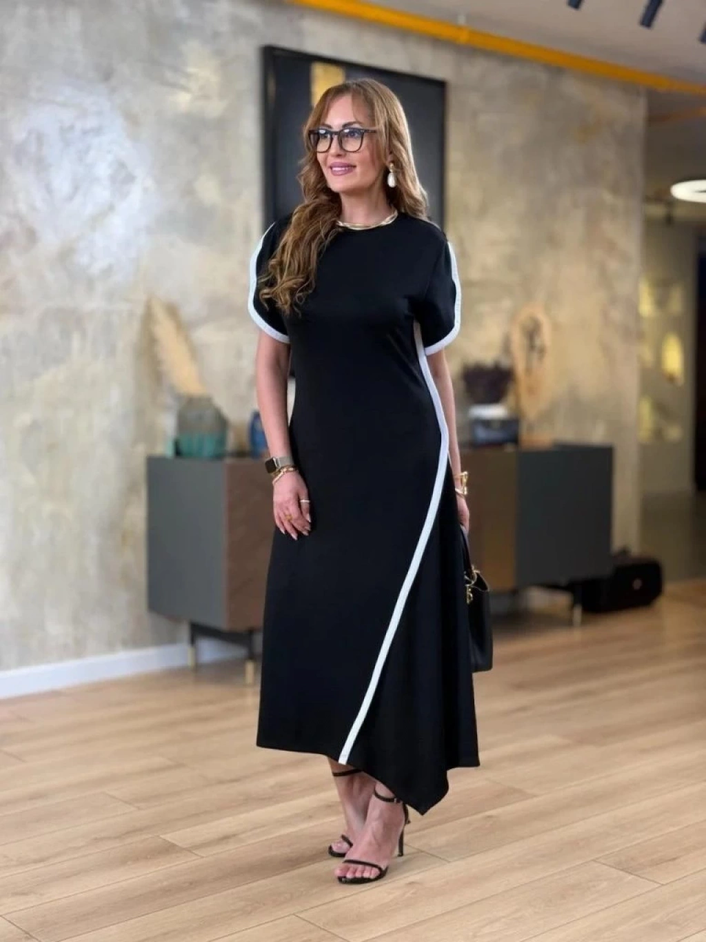 Kadın Kısa Kollu Bisiklet Yaka çift şerit Renk Detaylı Asimetrik Kesim Viskon Iki Iplik Elbise