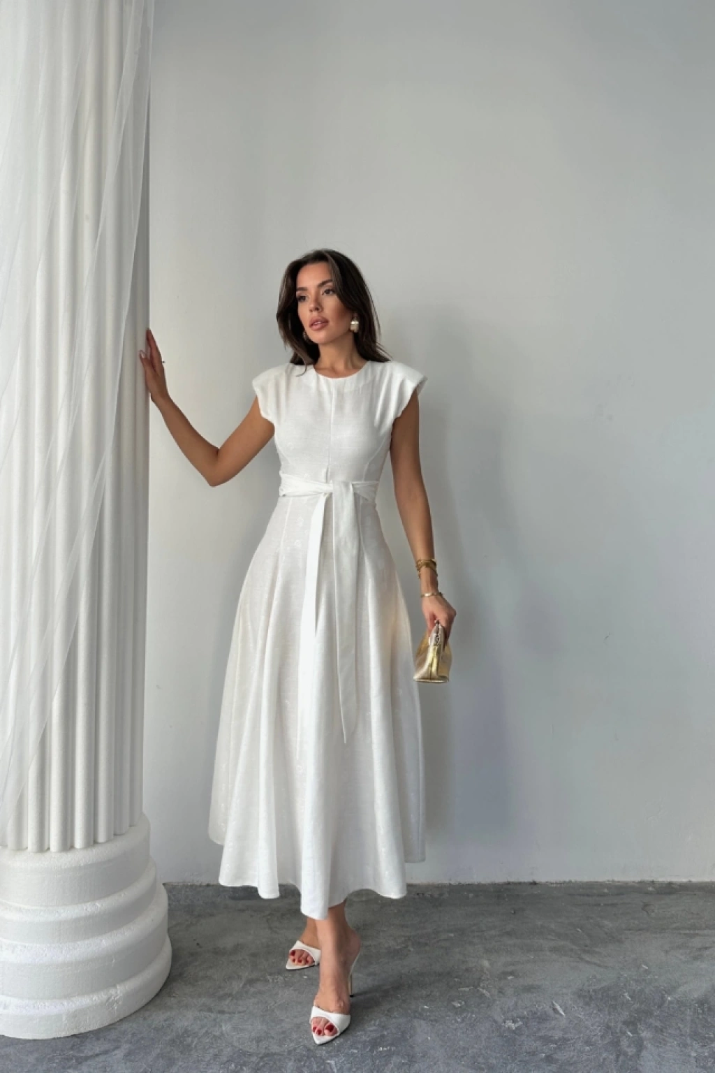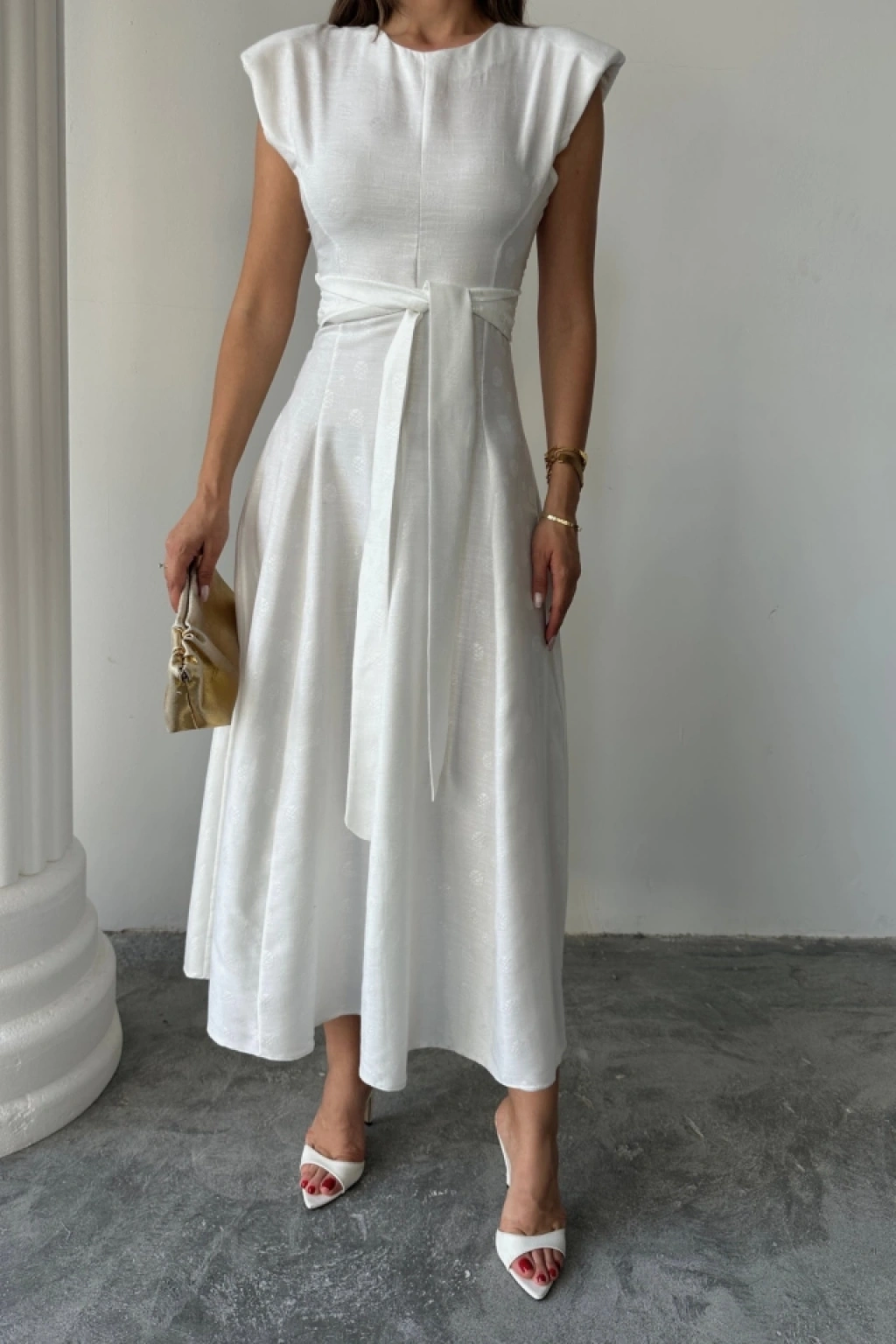 JAKAR KETEN VATKALI ELBİSE - Beyaz