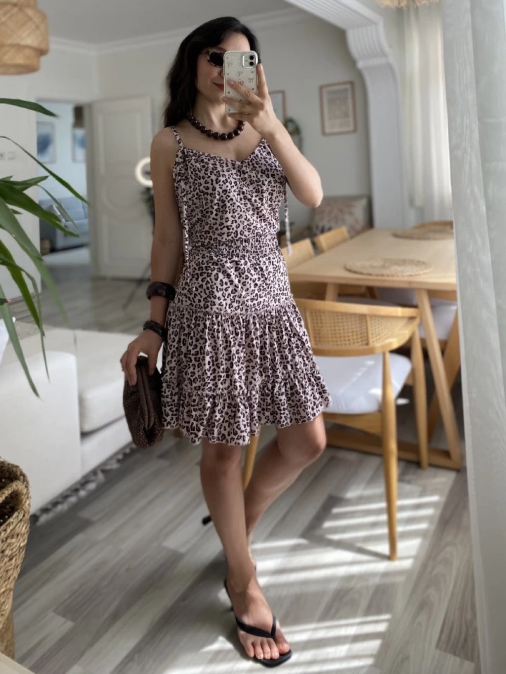 Kadın Askılı V Yaka Beli Pileli Leopar Desen Eteği Fırfırlı Süprem Elbise