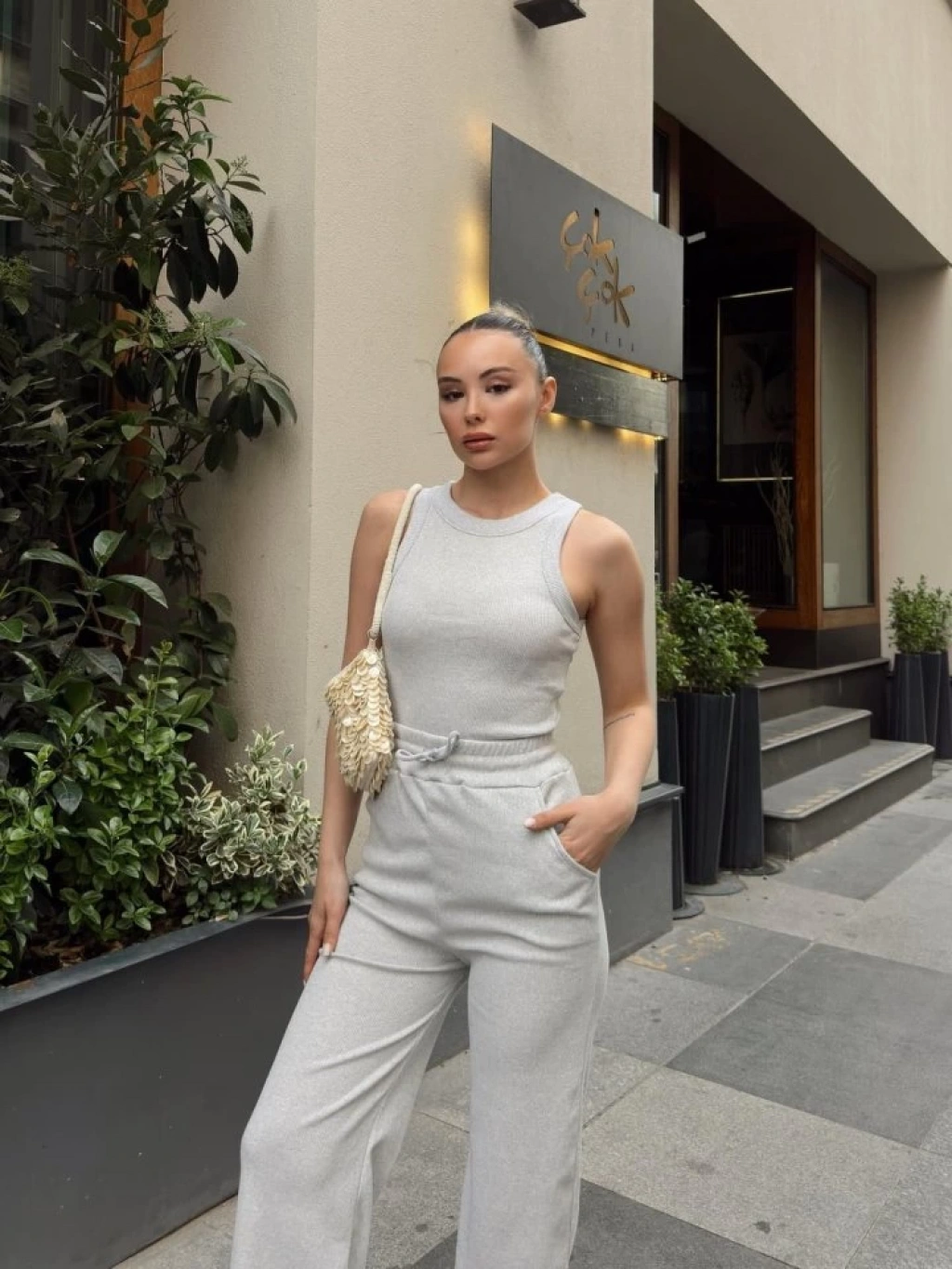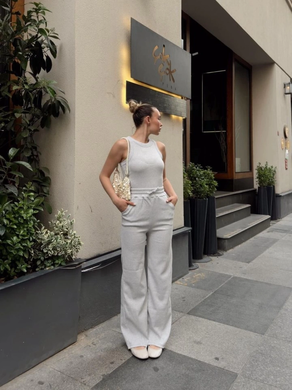 Kadın Kaşkorse Kumaş Atlet Ve Yüksek Bel Bol Paça Pantolon Ikili Takım