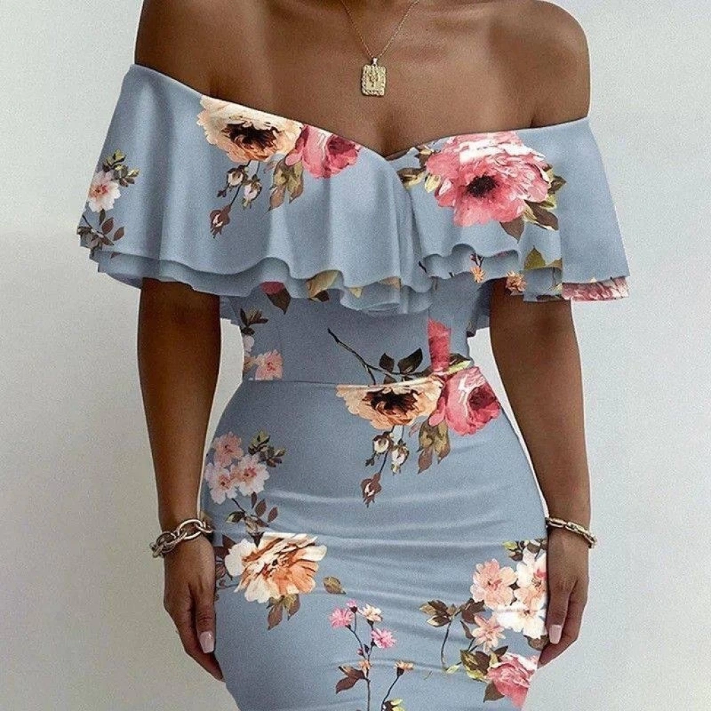 Kadın Madonna Yaka çiçek Baskılı Volan Detay Kalem Elbise