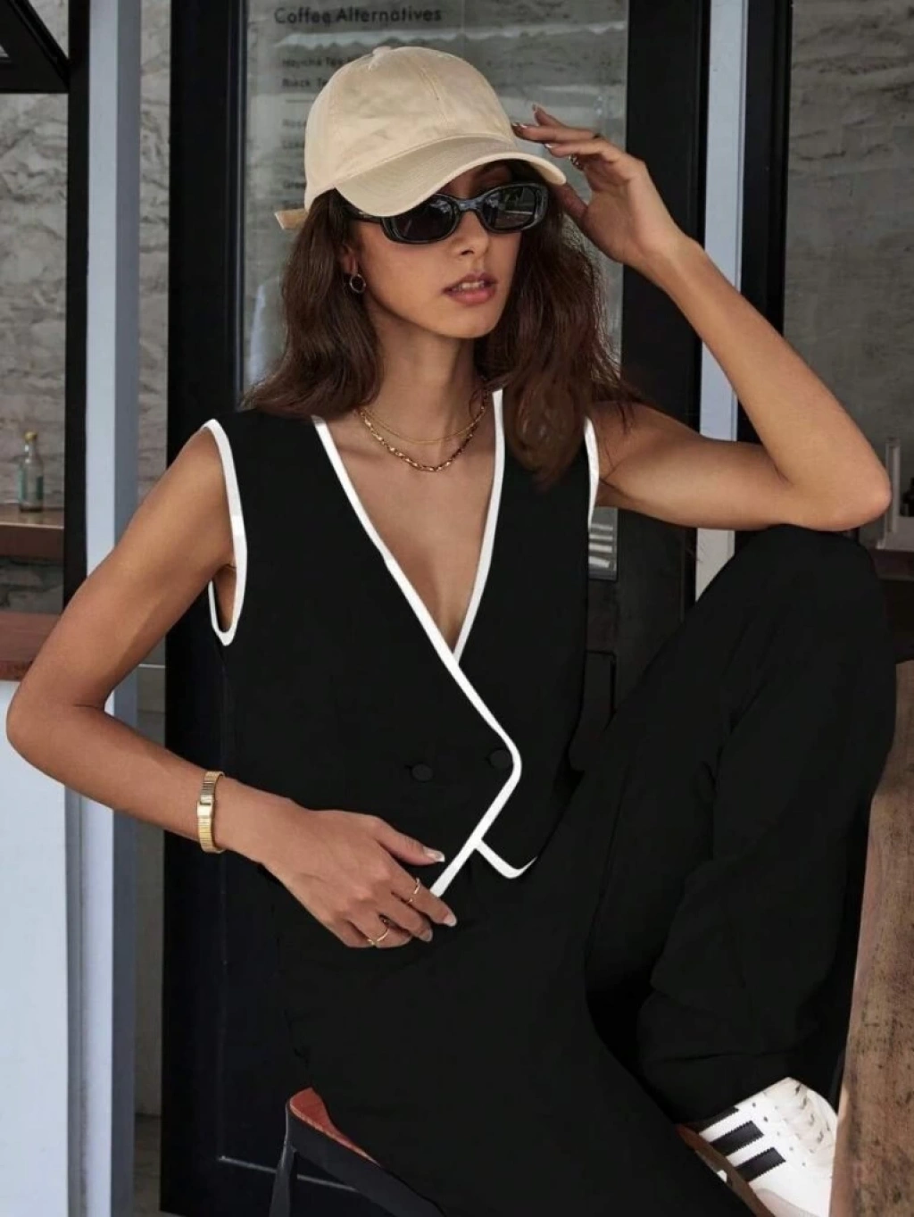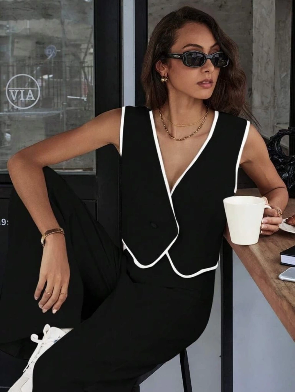 Kadın Kolsuz V Yakalı Düğmeli Ithal Krep Yelek Ve Pantolon Ikili Takım