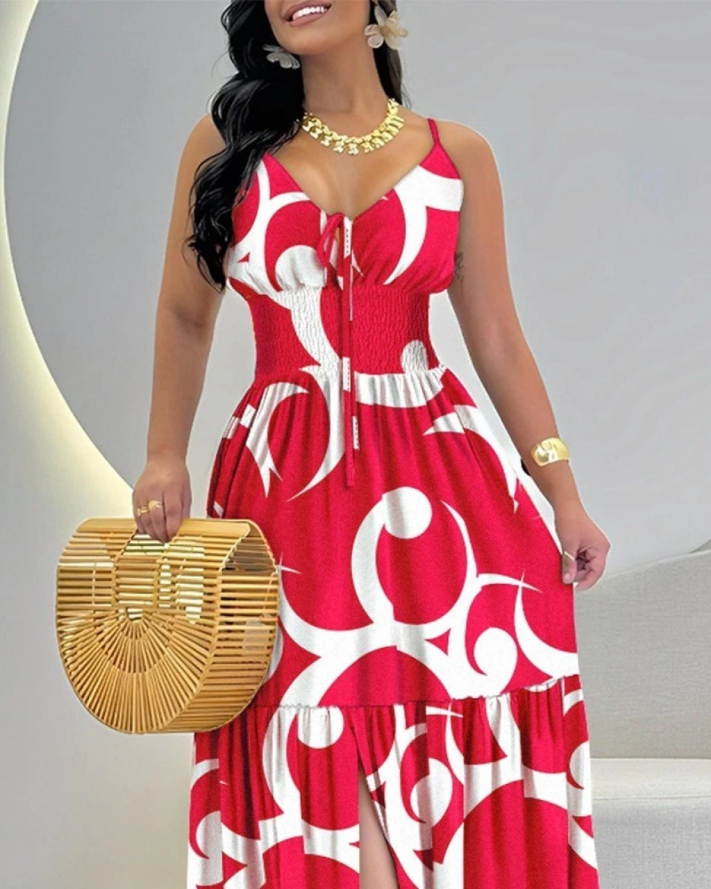 Kadın Ip Askılı Dekolteli Bağcıklı Yırtmaçlı Desenli Süprem Elbise