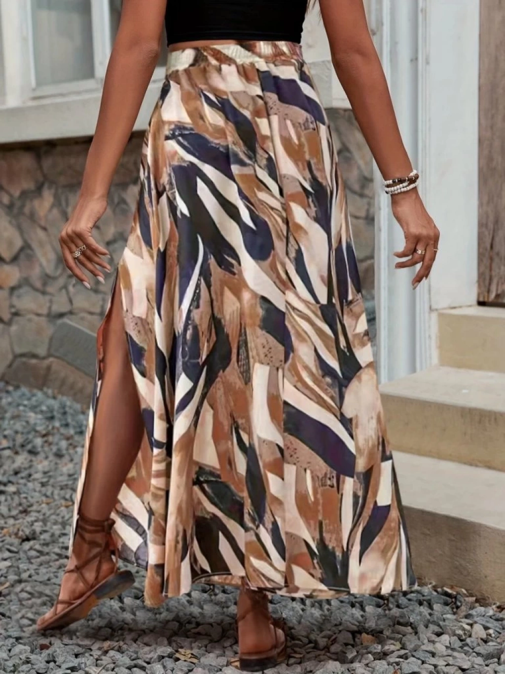 Kadın Beli Büzgülü Yandan Yırtmaçlı Desenli Süprem Etek