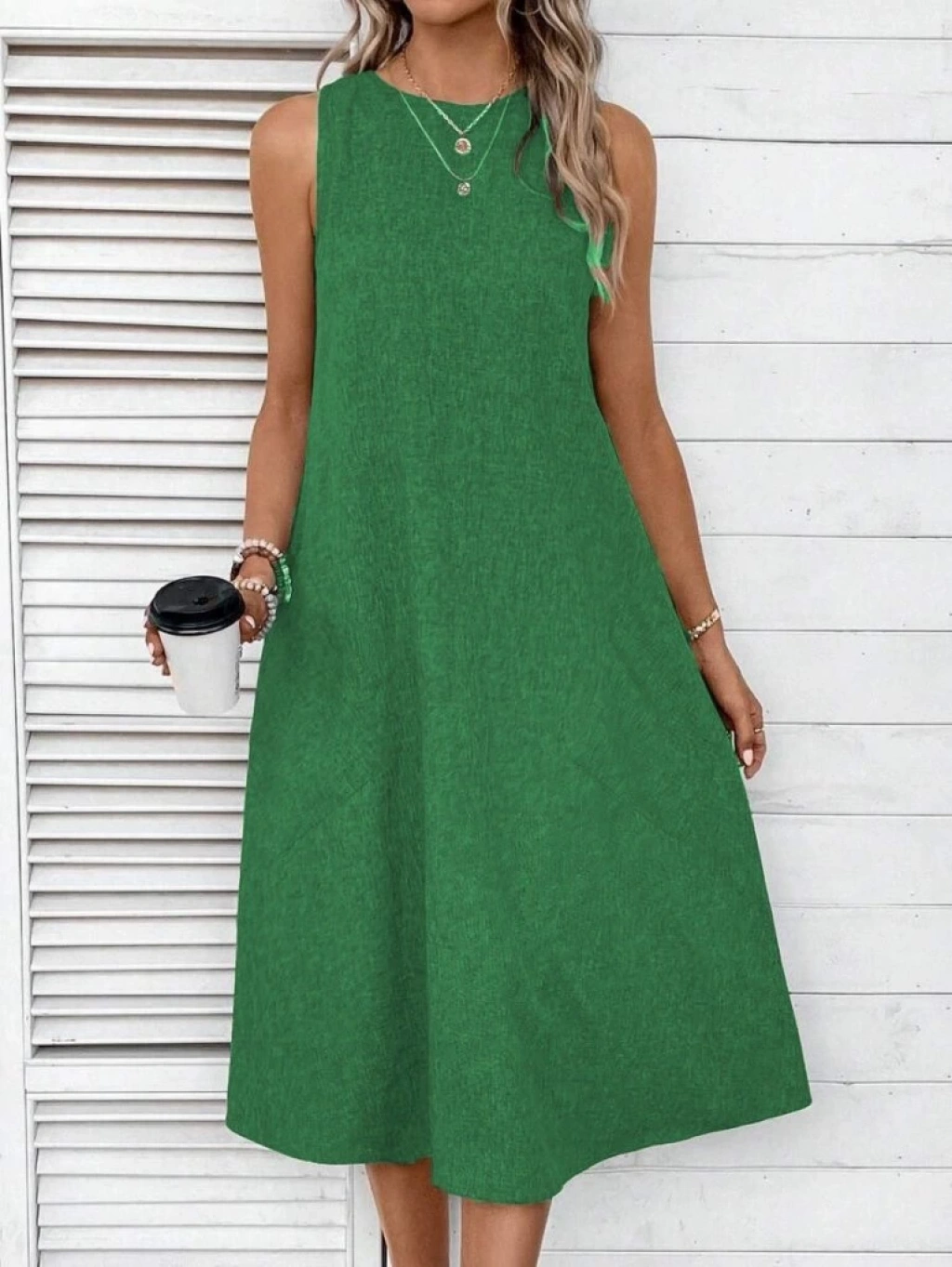 Kadın Kolsuz Bisiklet Yaka Cepli Midi Keten Elbise