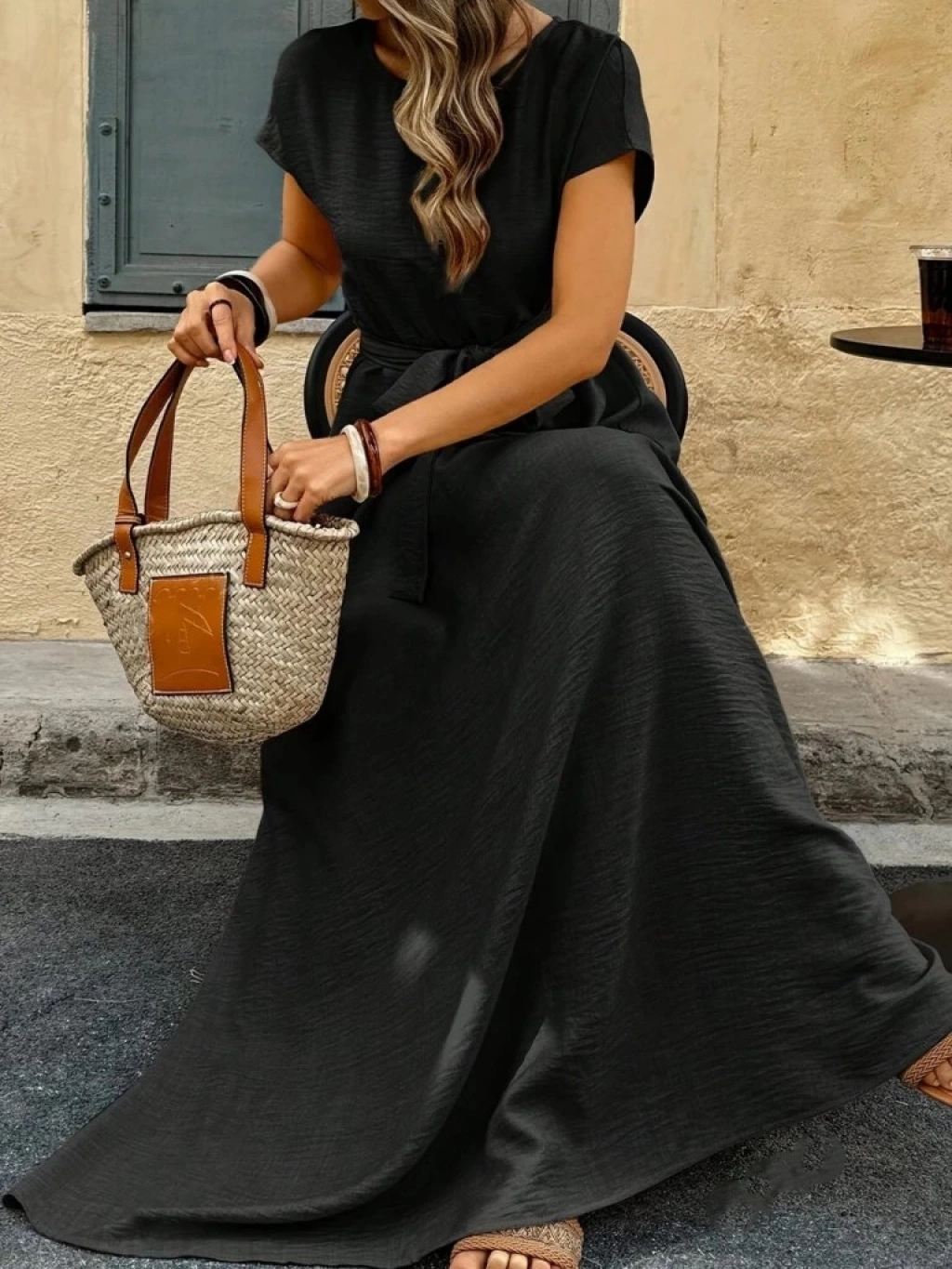 Kadın Kısa Kollu Kayık Yaka Beli Kuşaklı Aerobin Elbise