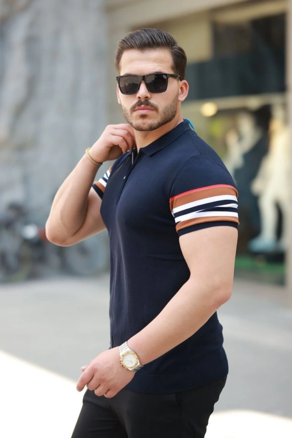 Erkek Fermuar Yakalı Kolları Desenli Kısa Kollu Tişört