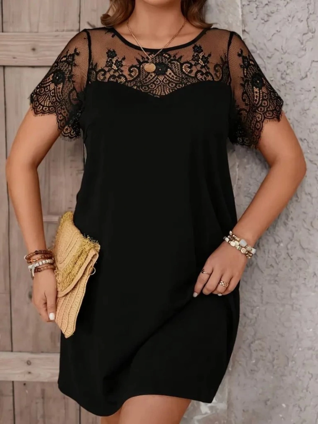 Kadın Kısa Kollu Dantel Bisiklet Yaka Ve Kol Dantel Detaylı Janjan Krep Elbise