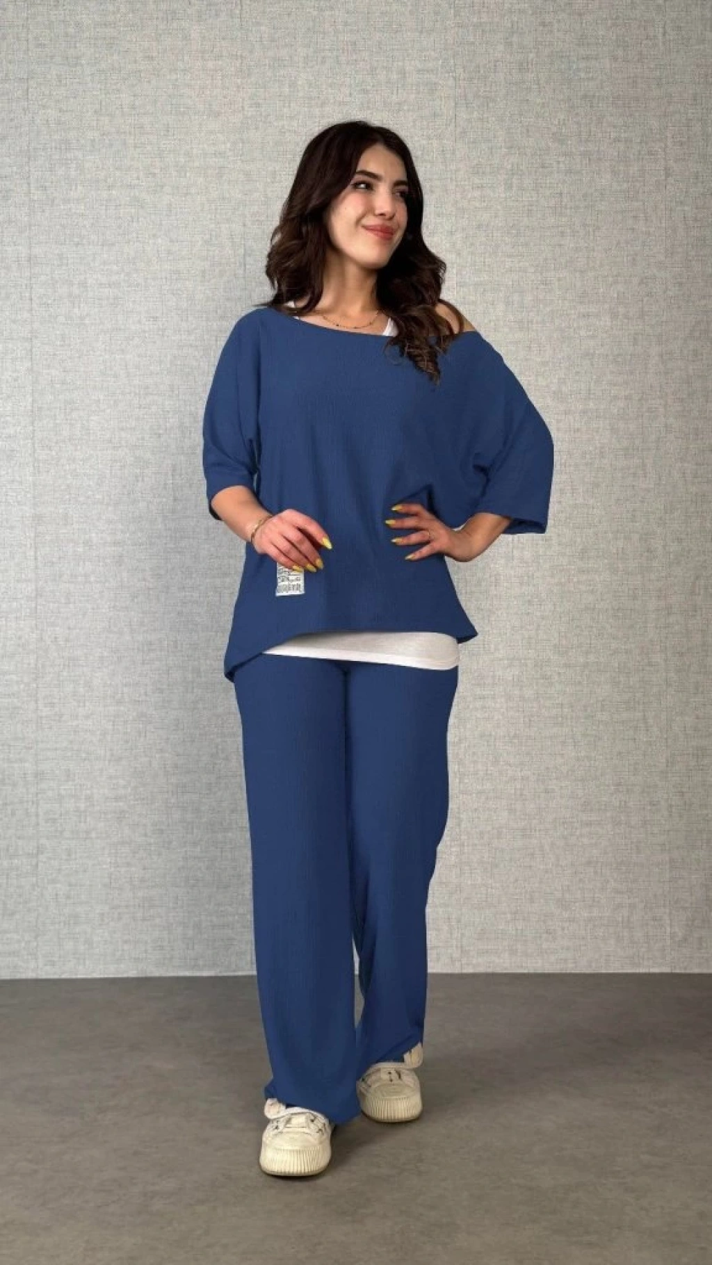 Kadın Kısa Kollu Omuzlardan Açık Yarasa Kollu Bürümcük Bluz Ve Pantolon Ve Viskon Atlet