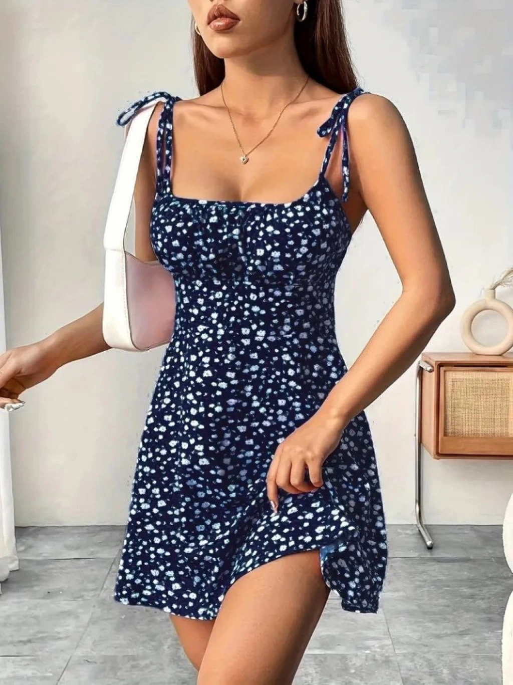 Kadın Askılı Büzgü Detaylı Kare Yaka çiçek Desenli Mini Süprem Elbise