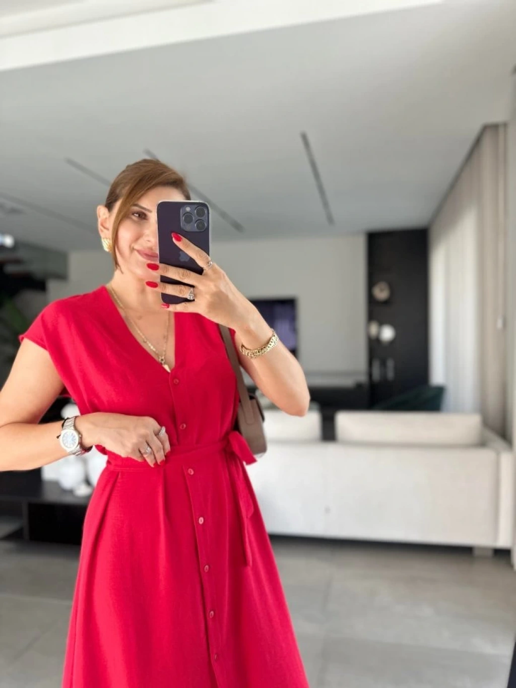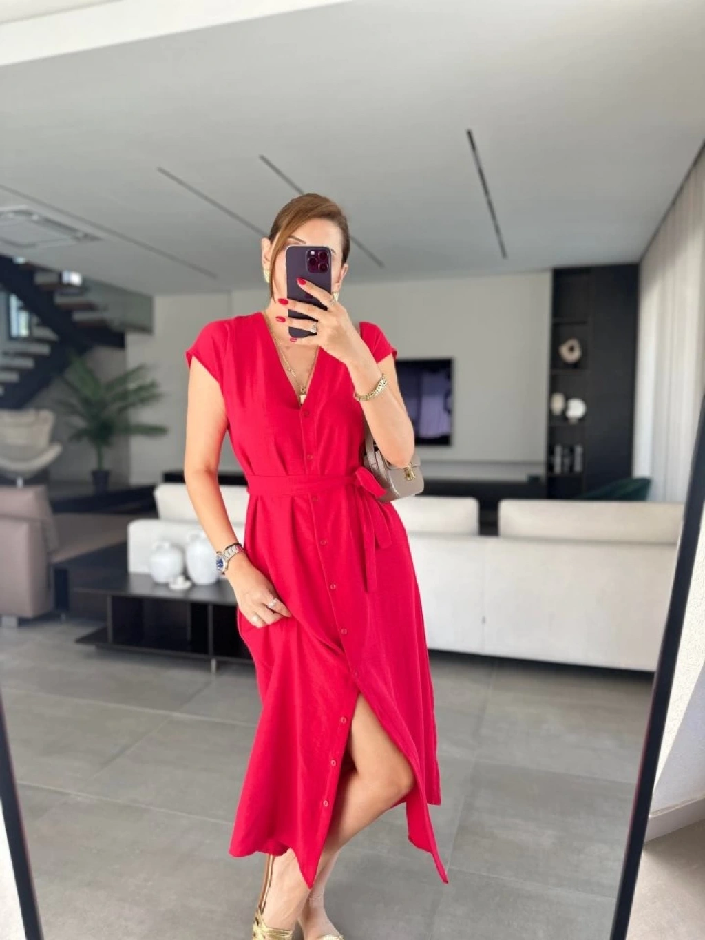 Kadınn V Yaka Düğme Detay Kuşak Dahil Elbise