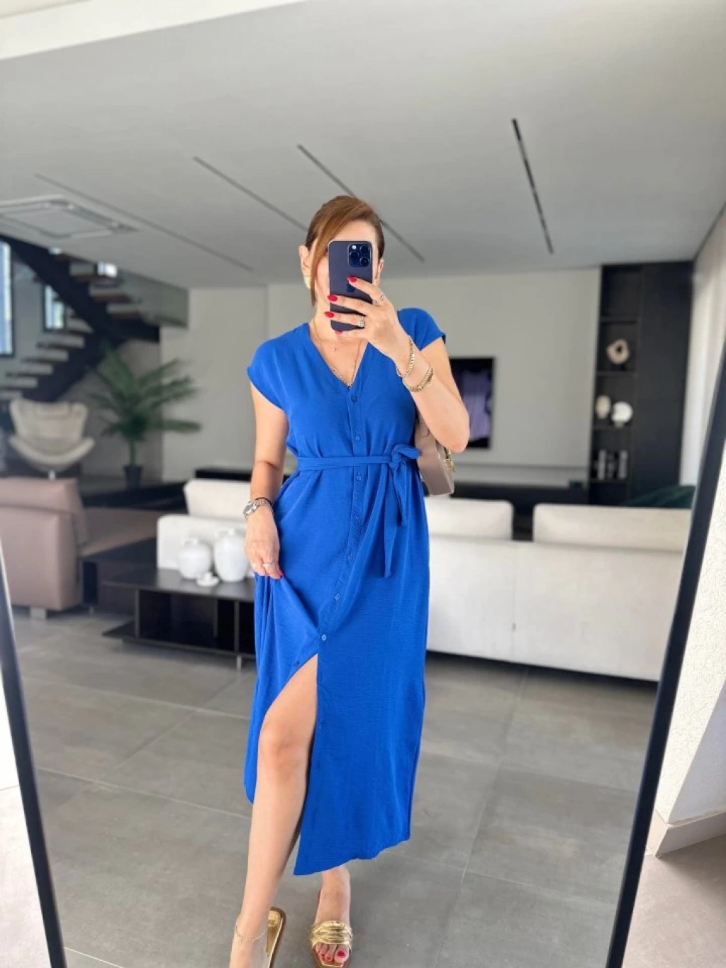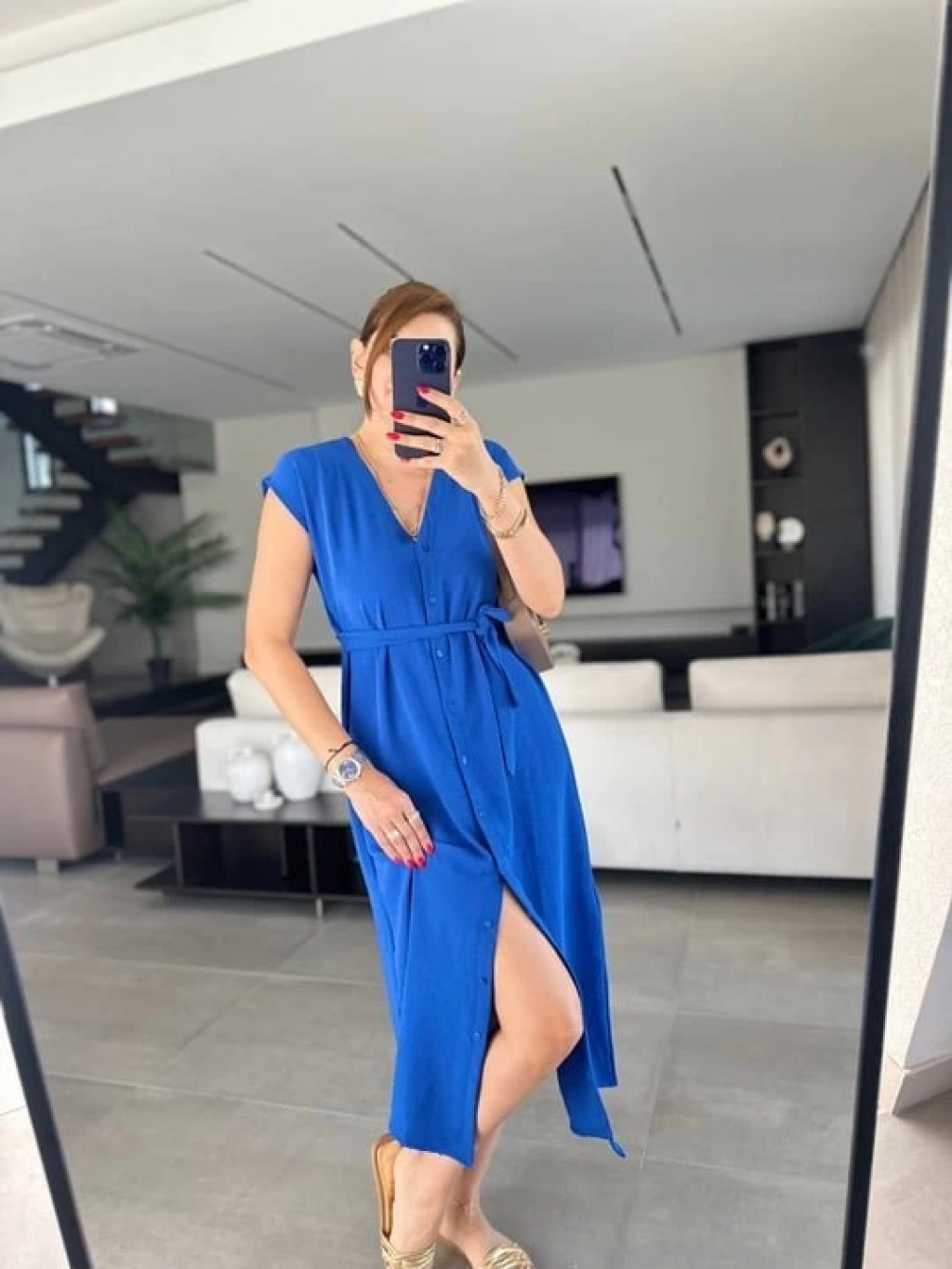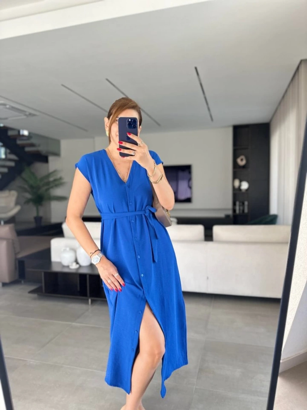 Kadınn V Yaka Düğme Detay Kuşak Dahil Elbise