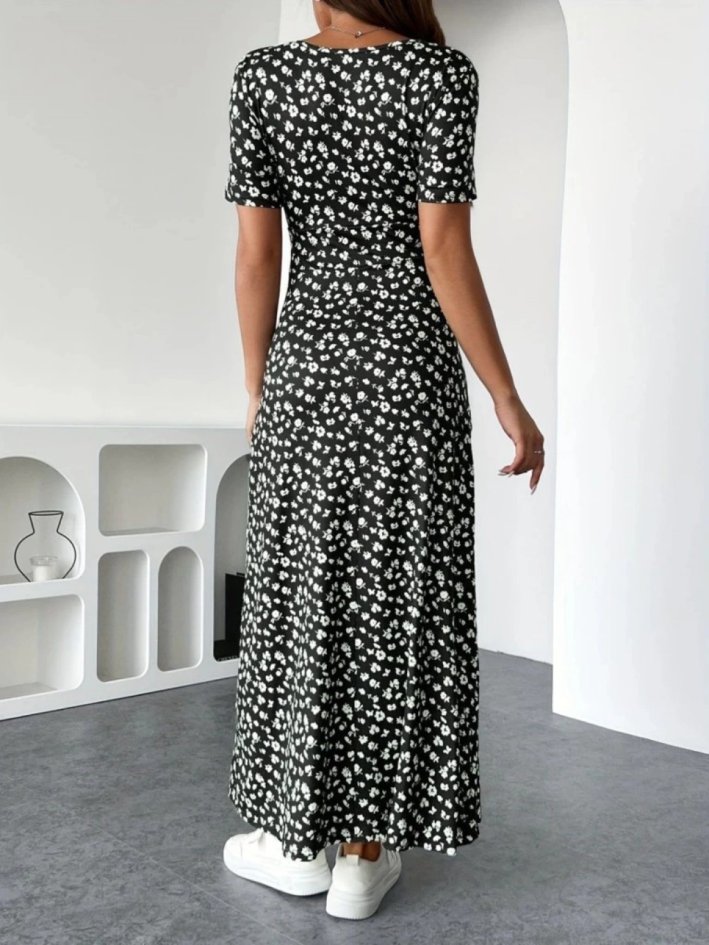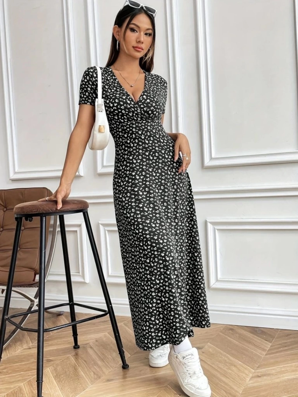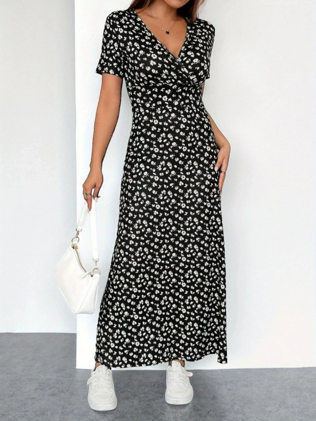 Kadın Kısa Kollu Kruvaze Yakalı çiçek Desenli Süprem Elbise