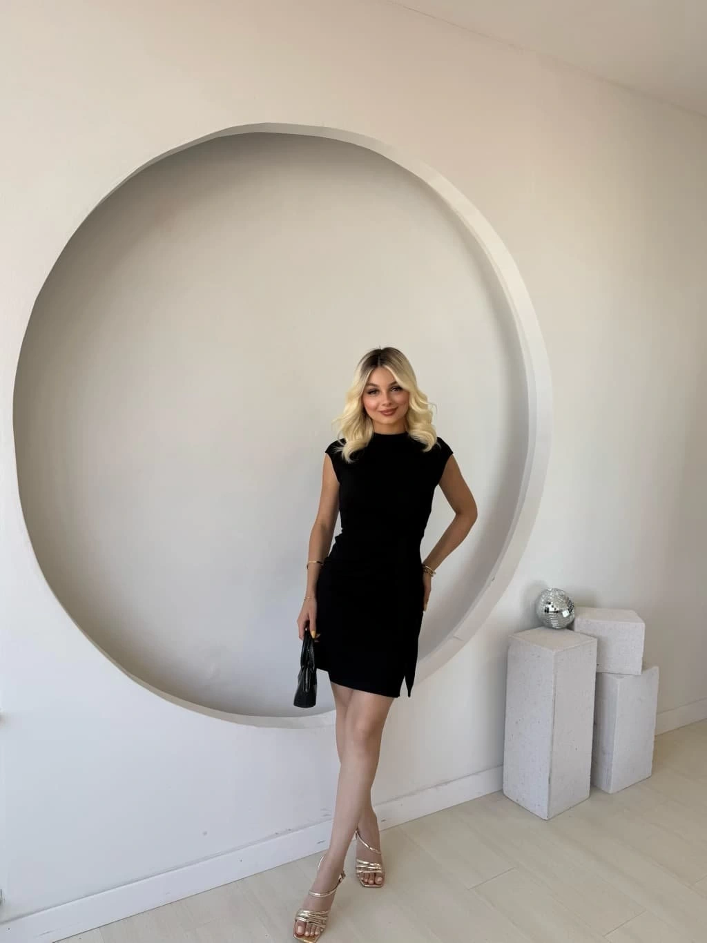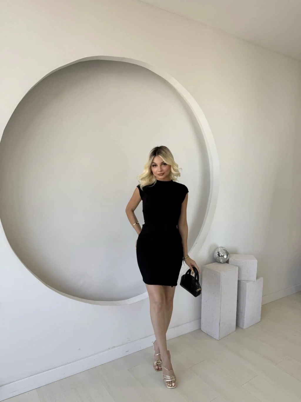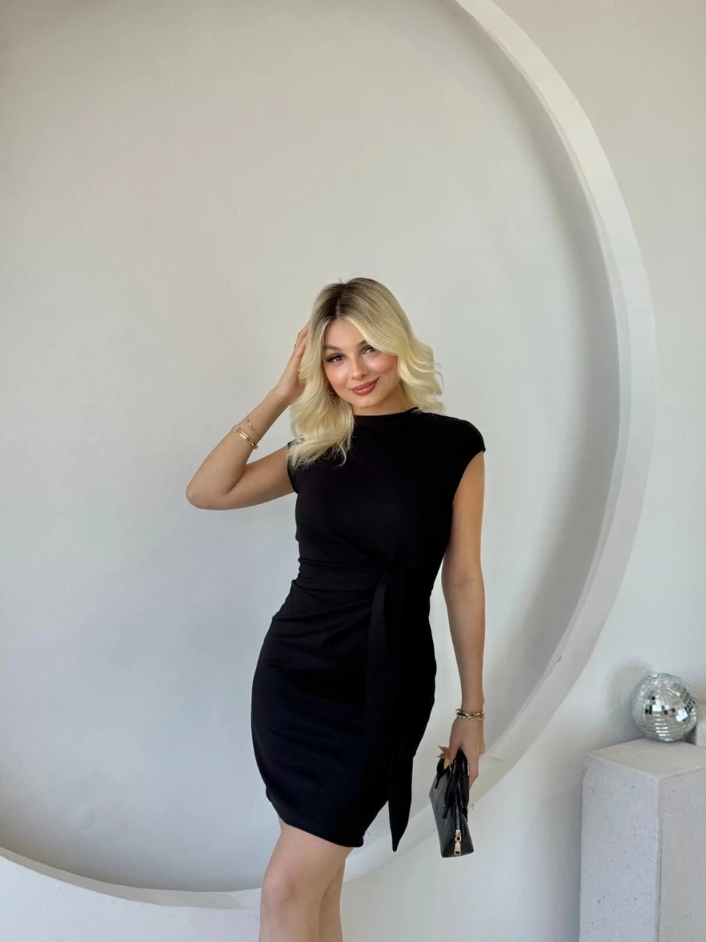 Kadın Kısa Kap Kollu Bisiklet Yaka Belden Bağlamalı Modal Mini Elbise